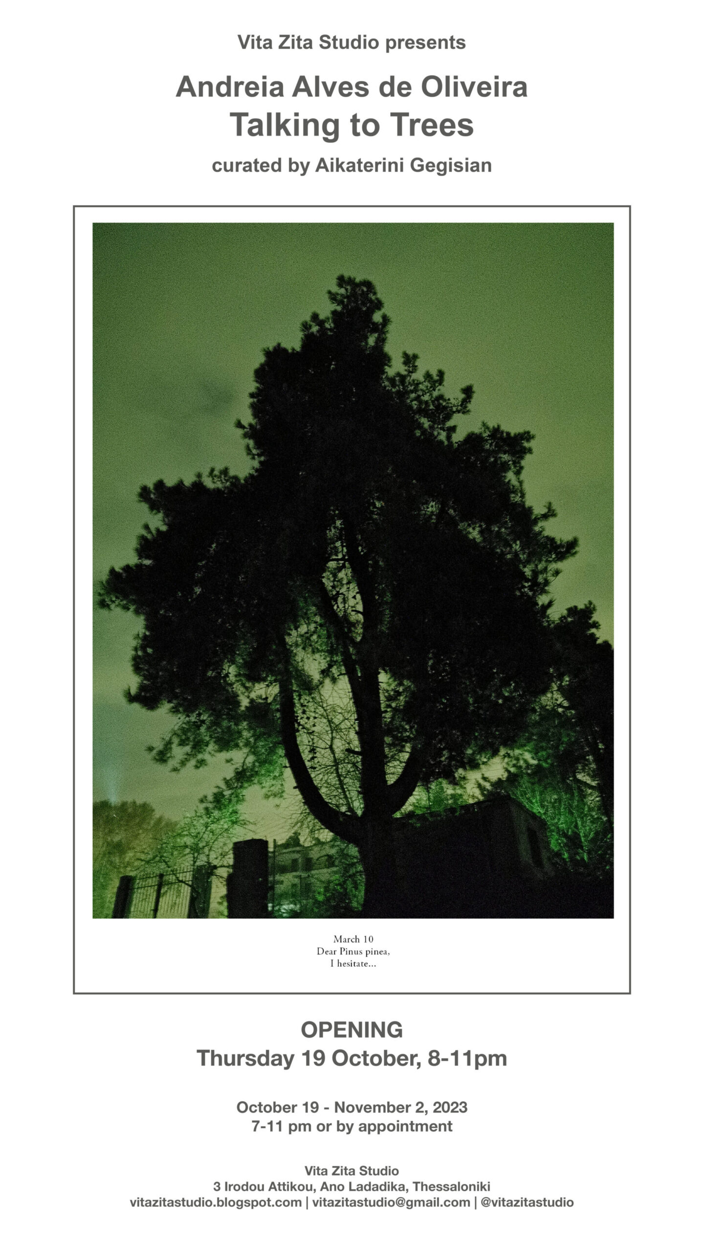 Πληροφορίες: Εγκαίνια Πέμπτη 2 Νοεμβρίου 2023, 16.00 – 21.30 | Διάρκεια: 02 -30.11.2023 | Ώρες λειτουργίας: Τρ., Πε., Πα.: 12.00 – 20.00 / Τε., Σα.: 12.00 -15.00