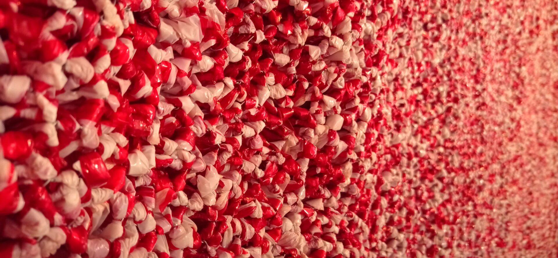 Η επαναλαμβανόμενη γραφή της braille των επίτοιχων έργων εμπνέεται από τον ομώνυμο κώδικα και συναντά τους σημειωτικούς κόμπους της ασπροκόκκινης απαγορευτικής ταινίας των γλυπτικών εγκαταστάσεων. Από το πλαίσιο διαλόγου με τον θεατή αφαιρείται οποιαδήποτε δυνατότητα συμβατικής ανάγνωσης του περιεχομένου της εγκατάστασής τους. Οι επιφάνειες αλουμινίου καθίστανται κλειστές προς ανάγνωση, αλλά ταυτόχρονα απόλυτα ανοιχτές προς ερμηνεία. Η αδυναμία άμεσης αλληλεπίδρασης με το κείμενο και η ανάδειξη της αναγλυφότητας της μορφής του, το καθιστούν ένα ζωντανό εικαστικό αίνιγμα, που συνομιλεί υπαινικτικά με τους χιλιάδες χειροποίητους κόμπους που βρίσκονται άοκνα γύρω του.