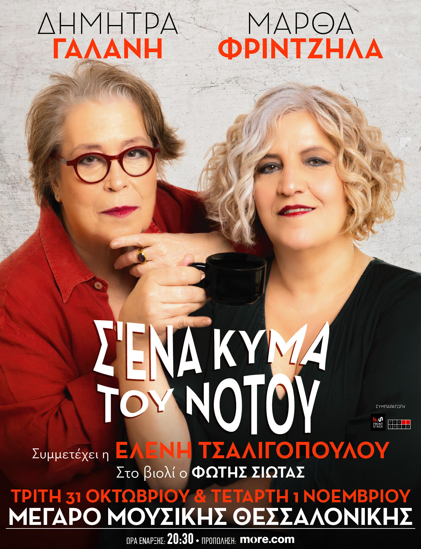 H Δήμητρα Γαλάνη και η Μάρθα Φριντζήλα την Τρίτη 31 Οκτωβρίου και την Τετάρτη 1 Νοεμβρίου, σε συνέχεια των δύο sold out εμφανίσεών τους στο Μέγαρο Μουσικής Αθηνών, έρχονται πάνω «Σ’ ένα κύμα του Νότου» στο Μέγαρο Μουσικής Θεσσαλονίκης για ένα ακόμα συναρπαστικό μουσικό ταξίδι. Οι δύο ερμηνεύτριες μας προσκαλούν να τραγουδήσουμε μαζί τους διαχρονικά τραγούδια και διασκευές με νέα προσέγγιση, μέσα από την πρωτότυπη ματιά των ταλαντούχων μουσικών που τις πλαισιώνουν.