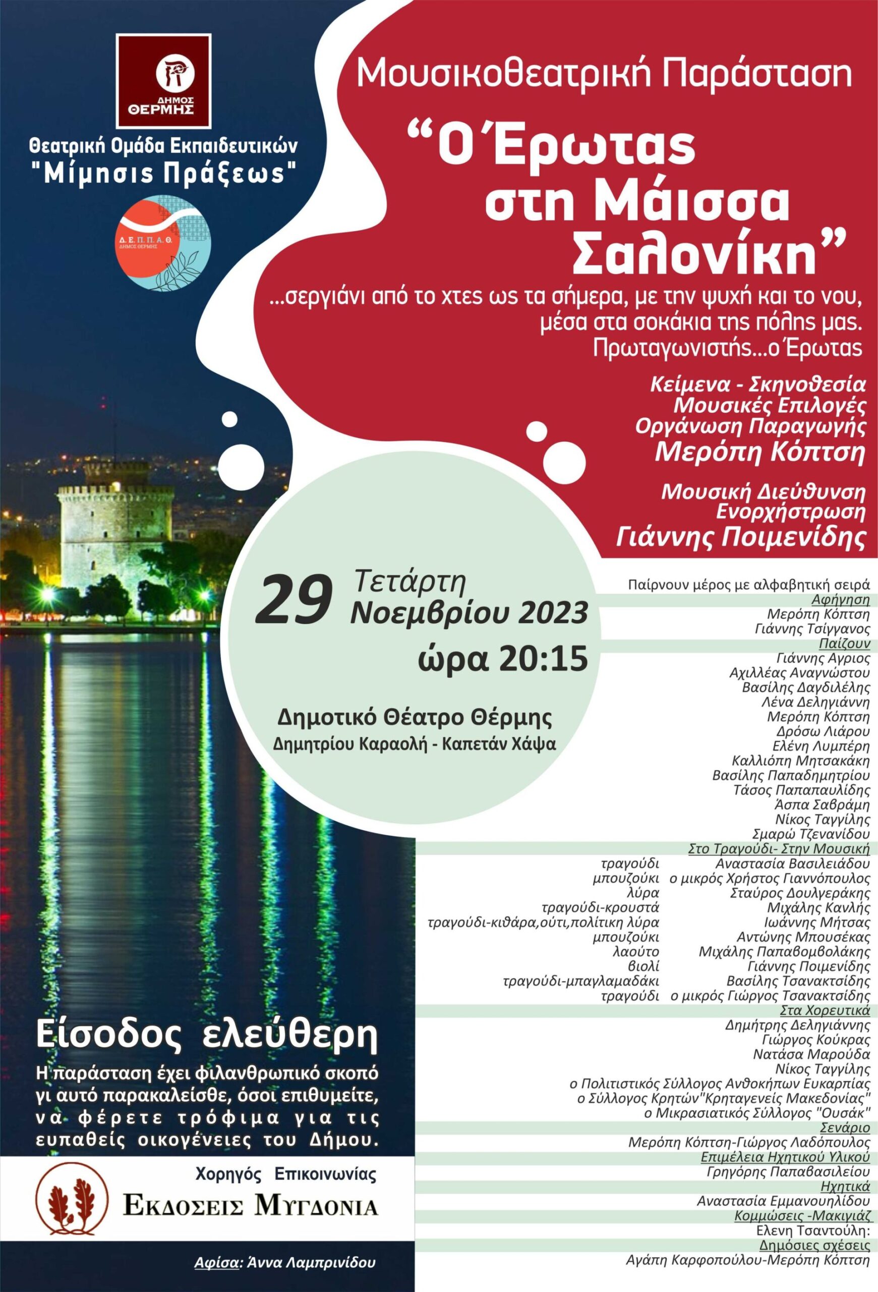 Τετάρτη 29 Νοεμβρίου 2023, ώρα 8.15 μμ. στο Δημοτικό Θέατρο Θέρμης Δημητρίου Καραολή-Καπετάν Χάψα,Θέρμη. Είσοδος ελεύθερη. Είναι μια μουσικοθεατρική παράσταση, με θέμα την ιστορία της Θεσσαλονίκης από την ίδρυσή της μέχρι σήμερα με κεντρικό άξονα τον έρωτα πλαισιωμένη από θεατρικά,μουσικά,χορευτικά δρώμενα και τραγούδια.Μέσα από μια γραμμική αφήγηση αλλά και από θεατρικά και μουσικά δρώμενα,περνάμε νοσταλγικά από γεγονότα ιστορικά και πολιτισμικά της πόλης μας.