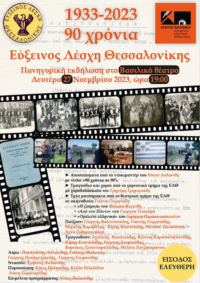 Με αφορμή τη συμπλήρωση 90 χρόνων από την ίδρυση της Ευξείνου Λέσχης και τιμώντας το πλουσιότατο εθνικό, κοινωνικό, πνευματικό και πολιτιστικό έργο της για το οποίο και τιμήθηκε από την Ακαδημία Αθηνών, το ΔΣ της Ευξείνου Λέσχης Θεσσαλονίκης σε συνεργασία με το Κέντρο Πολιτισμού της Περιφέρειας Κεντρικής Μακεδονίας διοργανώνουν εορταστική εκδήλωση. Η εκδήλωση θα πραγματοποιηθεί την Δευτέρα 27 Νοεμβρίου 2023, ώρα 19:00 στο Βασιλικό Θέατρο. Η εκδήλωση θα περιλαμβάνει: -Χαιρετισμούς από τον πρόεδρο της ΕΛΘ Γιάννη Αποστολίδη και εκπρόσωπο της Περιφέρειας Κεντρικής Μακεδονίας. -Αποσπάσματα από το ντοκιμαντέρ του Νίκου Ασλανίδη με τίτλο: «90 χρόνια σε 90’» -Τραγούδια και χορούς από το χορευτικό τμήμα της ΕΛΘ -Τρία μονόπρακτα από το θεατρικό τμήμα της ΕΛΘ, σε σκηνοθεσία Γιάννη Γεωργιάδη. • «Η ζουρνά» του Φίλωνα Κτενίδη. • «Από τον Πόντο» του Γιώργου Τσουλφά • «Ομιλείται ελληνικά» του Δημήτρη Παρασκευόπουλου.