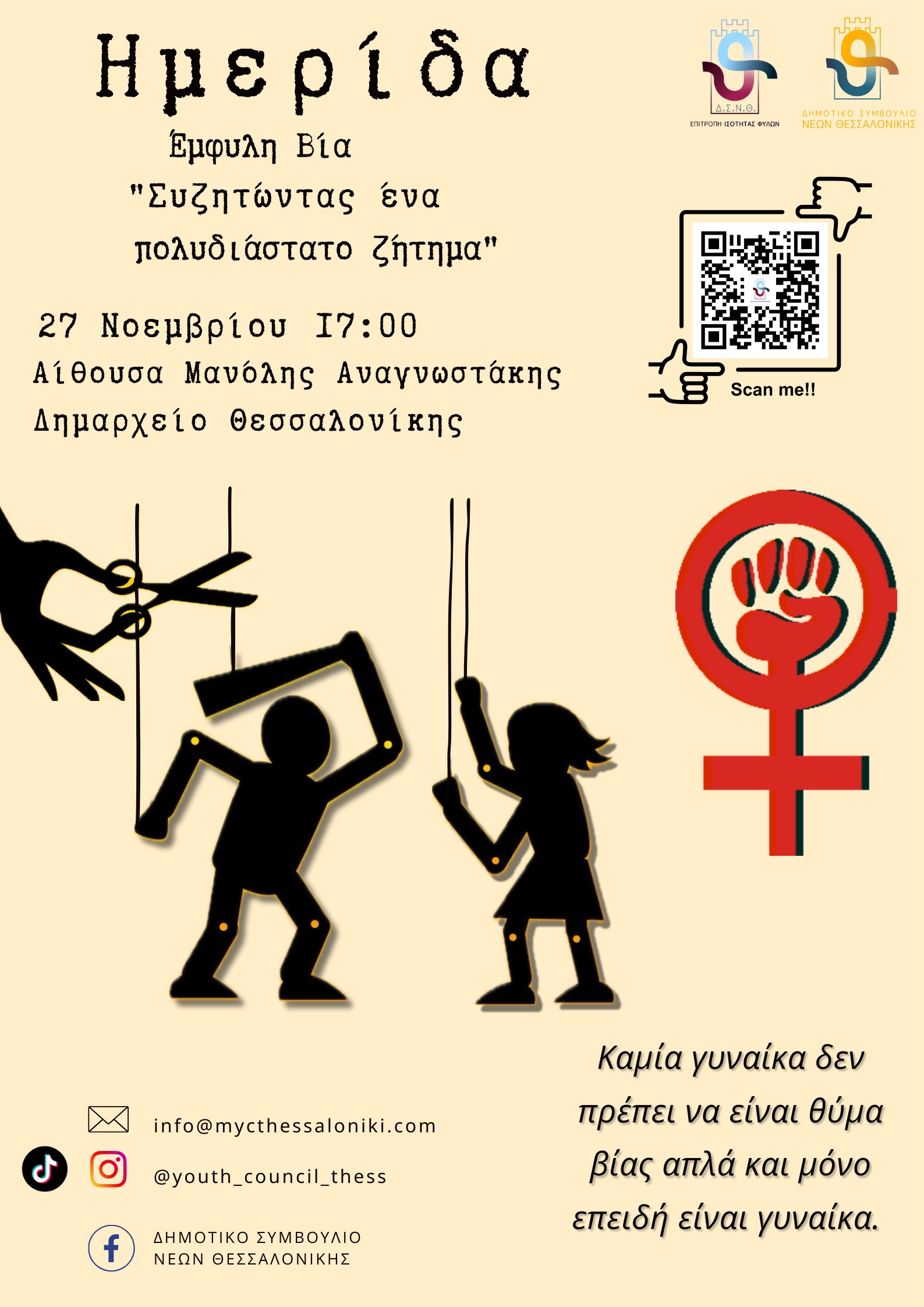 Με αφορμή την Διεθνή Ημέρα για την εξάλειψη της βίας κατά των γυναικών (25η Νοεμβρίου) το Η Επιτροπή Ισότητας των Φύλων του Δημοτικού Συμβούλιου Νέων Θεσσαλονίκης διοργανώνει την εκδήλωση με τίτλο «Έμφυλη Βία» την Δευτέρα 27.11.2023 στις 17.00 στο Δημαρχείο Θεσσαλονίκης (Διεύθυνση Βασιλέως Γεωργίου Α’ αριθμ.1-Αίθουσα Μανώλης Αναγνωστάκης).