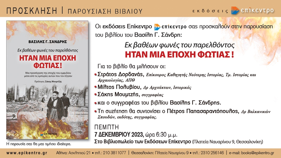 «Εκ βαθέων φωνές του παρελθόντος ΗΤΑΝ ΜΙΑ ΕΠΟΧΗ ΦΩΤΙΑΣ!» | Βιβλιοπωλείο των Εκδόσεων Επίκεντρο (Πλατεία Ναυαρίνου 9, Θεσσαλονίκη