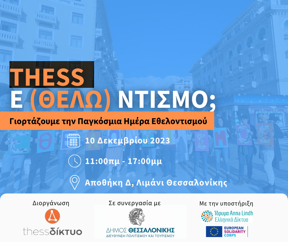 Το Thess-Δίκτυο, το άτυπο δίκτυο των εθελοντικών οργανώσεων και φορέων της κοινωνίας των πολιτών της Θεσσαλονίκης, γιορτάζει την Παγκόσμια Ημέρα Εθελοντισμού με μια ξεχωριστή γιορτή στην Αποθήκη Δ στο λιμάνι, την Κυριακή 10 Δεκεμβρίου 2023, από τις 11:00 ως τις 17:00.