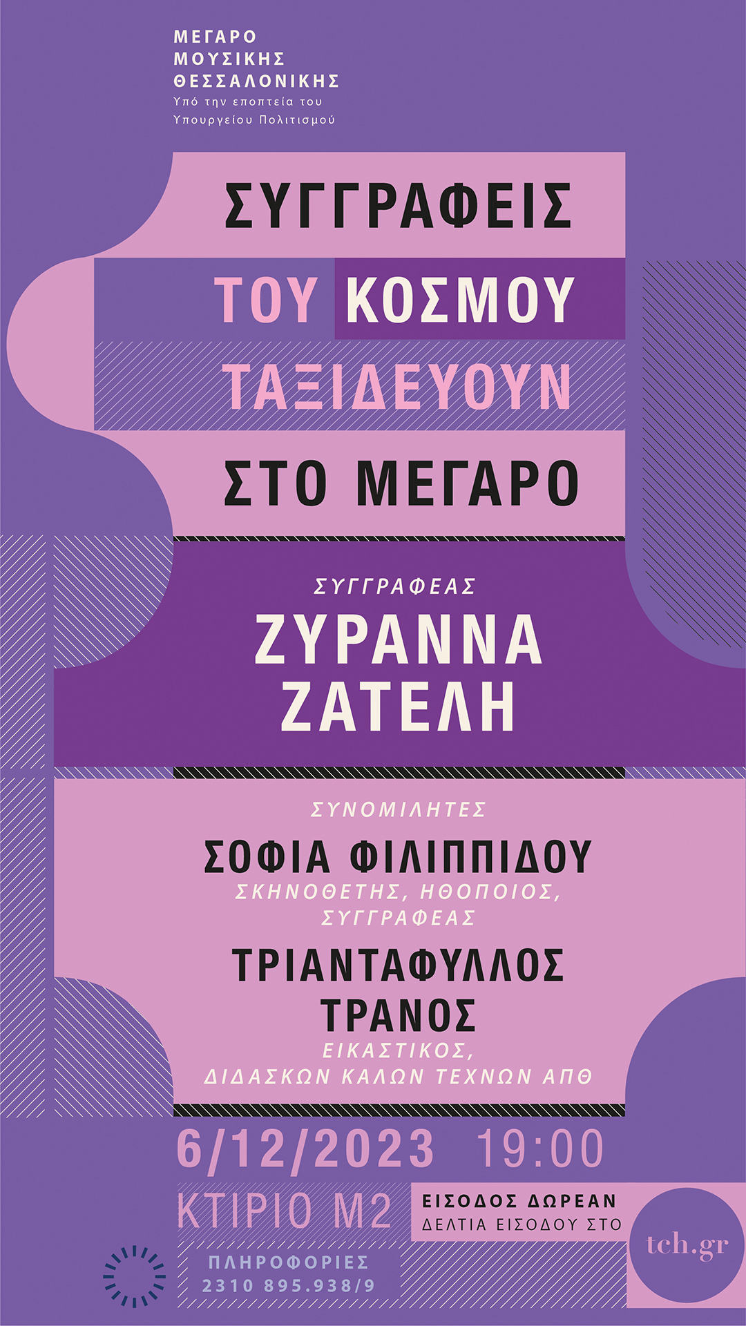 Την Τετάρτη 6/12, προσκεκλημένοι, για να «πρωταγωνιστήσουν» στην σκηνή της αίθουσας Αιμίλιος Ριάδης, είναι η συγγραφέας Ζυράννα Ζατέλη, η Σοφία Φιλιππίδου, ηθοποιός, σκηνοθέτης, συγγραφέας και ο Τριαντάφυλλος Τρανός, εικαστικός, διδάσκων στη Σχολή Καλών Τεχνών του Αριστοτελείου Πανεπιστημίου Θεσσαλονίκης. Η τελευταία εκδήλωση για το 2023 του Κύκλου «Συγγραφείς του κόσμου ταξιδεύουν στο Μέγαρο» θα φιλοξενήσει ανθρώπους της τέχνης και του πνεύματος που έχουν όλοι καταγωγή από την ευρύτερη περιοχή της Θεσσαλονίκης. Αφορμή της επόμενης συνάντησης είναι το πιο πρόσφατο συγγραφικό έργο της Ζυράννας Ζατέλη και μια συνολική κουβέντα για την εκδοτική της πορεία.