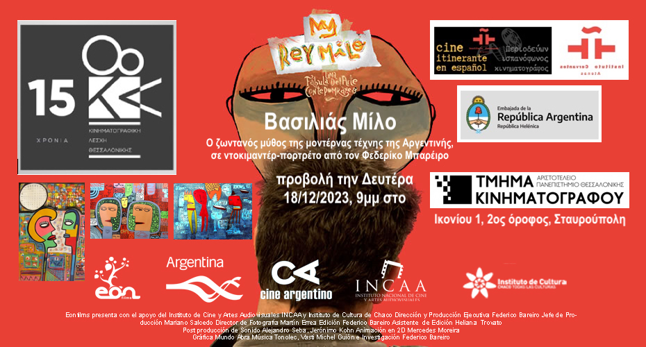 Η Κινηματογραφική Λέσχη Θεσσαλονίκης [ΚΛΘ] και το Τμήμα Κινηματογράφου του Α.Π.Θ., μέσω του προγράμματος Περιοδεύων ισπανόφωνος κινηματογράφος, σε συνεργασία με το Ινστιτούτο Θερβάντες και την Πρεσβεία της Αργεντινής στην Ελλάδα, παρουσιάζουμε το ντοκιμαντέρ-πορτρέτο του Φεδερίκο Μπαρέιρο, Βασιλιάς Μίλο – ένας ζωντανός μύθος της μοντέρνας τέχνης, την Δευτέρα 18 Δεκεμβρίου 2023, 9μμ, στην αίθουσα προβολών του Τμήματος Κινηματογράφου [Ικονίου 1, 2ος ορ, Σταυρούπολη Θεσσαλονίκης, τηλ. 2310-99.71.61]. Την 5η χειμερινή μας προβολή προλογίζει ο κριτικός κινηματογράφου, μέλος της Π.Ε.Κ.Κ., Κώστας Καρδερίνης. Μετά την προβολή ακολουθεί συζήτηση. Βασιλιάς Μίλο Rey Milo / King Milo [2012-2014 Αργεντινή, 90λ] του Federico Bareiro. Σενάριο, σκηνοθεσία: Federico Bareiro. Μουσική: Charo Bogarin, Vasti Michel, Diego Perez. Διεύθυνση φωτογραφίας: Martín Errea. Μοντάζ: Federico Bareiro, Heliana Trovato. Διεύθυνση παραγωγής: Mariano Salcedo, Federico Bareiro. Animation: Mercedes Moreira. Βοηθοί παραγωγής: Iliana Ochoa, Magdalena Risso. Ήχος: Jeronimo Kohn, Diego Marcos López, Diego Marcone, Alejandro Seba. Σύνοψη: Παθιασμένη προσωπογραφία του Μίλο Λόκετ [Milo Lockett], του σημαντικότερου εικαστικού καλλιτέχνη της Αργεντινής. Λατρεμένος όσο και ξορκισμένος, ο Μίλο ζει σαν ροκ σταρ και ζωγραφίζει σα να μην υπάρχει αύριο. Ωστόσο, η ζωή στην αγροτική γενέτειρά του βασίζεται στις φιλανθρωπικές του δραστηριότητες. Μια κινηματογραφική προσωπογραφία περί τέχνης, επιχειρήσεων, κοινωνικής προσφοράς και αλληλεγγύης. Σημείωμα του σκηνοθέτη: Το πρώτο πράγμα που με τράβηξε στον Milo Lockett ήταν το έργο του που είδα στην Galeria Teresa de Anchorena το 2009. Έμεινα έκθαμβος από τις παιδικές γραμμές του με γεμάτα χρώματα και τα παιδικά πρόσωπα που κοιτούσαν τον θεατή. Τα προχειρογραμμένα συνθήματα λειτούργησαν ως ερεθιστικό φόντο. Δεν είχα ξαναδεί κάτι παρόμοιο και μου κίνησε την προσοχή. Στη συνέχεια γνώρισα τον ίδιο, ο οποίος ήταν εξίσου ελκυστικός όχι μόνο λόγω της τέχνης του, αλλά και λόγω των κοινωνικών ενδιαφερόντων και δραστηριοτήτων του, μια νέα ματιά-στάση-ζωής, γέφυρα μεταξύ αλληλεγγύης και τέχνης. Η Ρεζιστένσια, πρωτεύουσα του Τσάκο, είναι μια πόλη θύλακας πολιτισμού που χαρακτηρίζεται από τα δημόσια γλυπτά της και την υπαίθρια τέχνη που μπορεί κανείς να δει σε κάθε γωνιά της. Στους περιφερειακούς δήμους Ελ Σαουζαλίτο, Φουέρτε Εσπεράνζα, Νουέβα Πομπέγια, από την άλλη, το τοπίο είναι άνυδρο, σε μεγάλη αντίθεση με την πρωτεύουσα, τόσο κλιματικά και εδαφολογικά όσο και στον επισφαλή τρόπο ζωής των κατοίκων. Τους περιηγηθήκαμε για να καταγράψουμε τη δράση που έκανε ο Μίλο με τους εφήβους με σύνδρομο Ντάουν: ζωγράφισαν τους εξωτερικούς τοίχους των σχολείων όπου φοιτούν παιδιά από τις κοινότητες των αυτοχθόνων Wichí. Στην πόλη επισκεφτήκαμε το εργαστήριο του Μίλο εν ώρα εργασίας, μερικά μπαρ που συχνάζει με τους φίλους του, πολιτιστικά κτίρια όπως το El Fogón de los Arrieros ή το δημοτικό σύμπλεγμα όπου έγινε η μπιενάλε τέχνης που διοργάνωσε ο καλλιτέχνης.