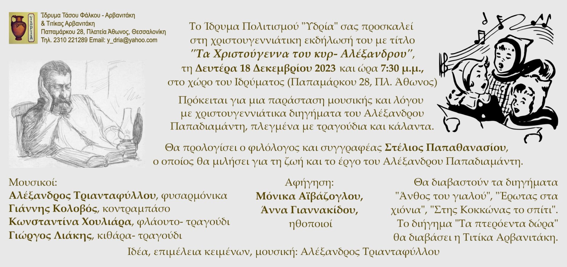 Το Ίδρυμα Πολιτισμού «Υδρία» σας προσκαλεί σε μια βραδιά που θα «μυρίζει» Χριστούγεννα με τίτλο «Τα Χριστούγεννα του κυρ- Αλέξανδρου», τη Δευτέρα 18 Δεκεμβρίου και ώρα 7:30 μ.μ., στο χώρο του Ιδρύματος, στην οδό Παπαμάρκου 28, στην περιοχή της Πλ. Άθωνος στη Θεσσαλονίκη.