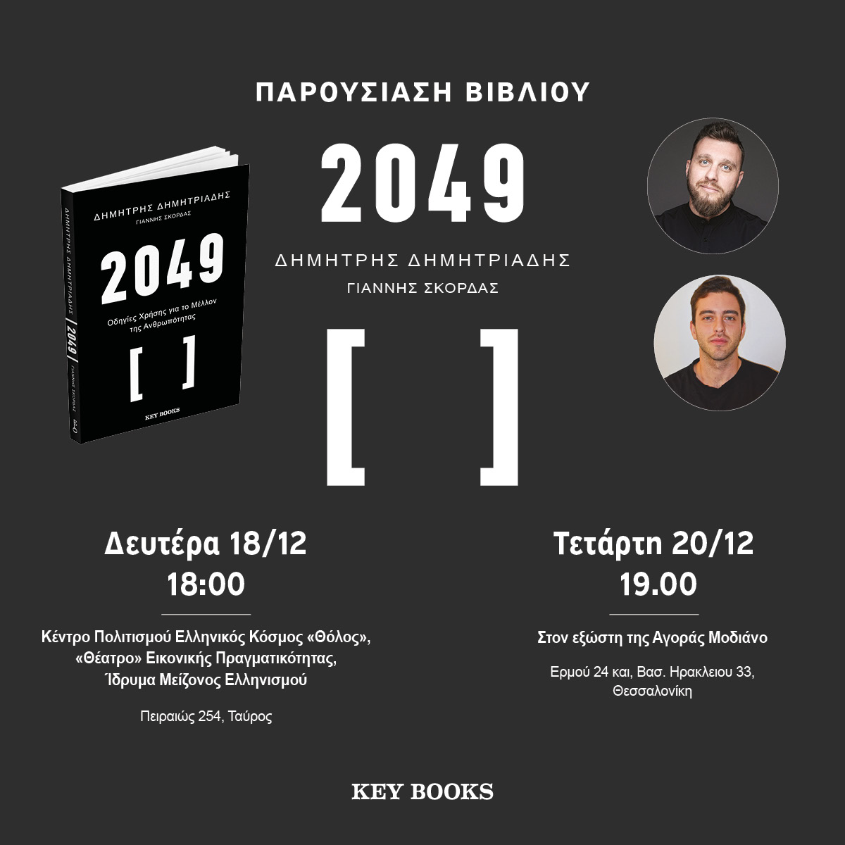 Ο Δημήτρης Δημητριάδης και ο Γιάννης Σκορδάς σας προσκαλούν σε δύο ανοιχτές εκδηλώσεις στην Αθήνα και τη Θεσσαλονίκη όπου θα παρουσιάσουν το βιβλίο τους: “2049 – Οδηγίες Χρήσεις για το Μέλλον της Ανθρωπότητας”, από τις εκδόσεις KEY BOOKS!