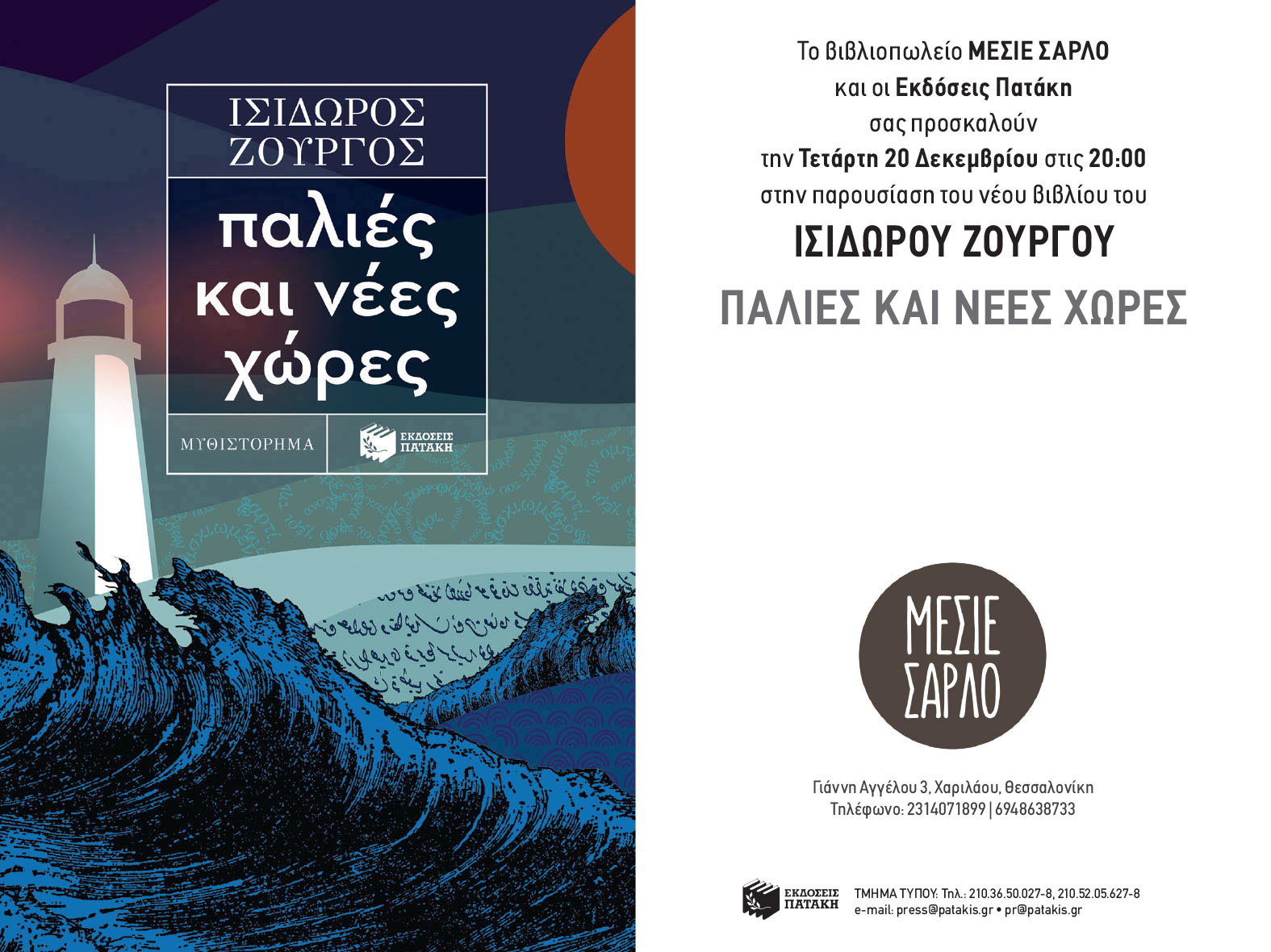 Το βιβλιοπωλείο ΜΕΣΙΕ ΣΑΡΛΟ και οι εκδόσεις Πατάκη σας προσκαλούν την Τετάρτη 20 Δεκεμβρίου στις 20:00 στην παρουσία του νέου βιβλίου του Ισίδωρου Ζουργού “Παλιές και νέες χώρες”.