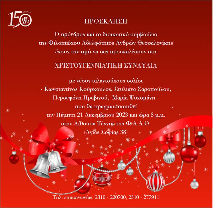 Την ίδια μέρα (20/12, 21.00) στο Μέγαρο Μουσικής Θεσσαλονίκης (Μ2) θα παρουσιαστεί η μουσική βραδιά «Βαλς in Red» σε συνεργασία με τη Συμφωνική Ορχήστρα του Δήμου Θεσσαλονίκης.