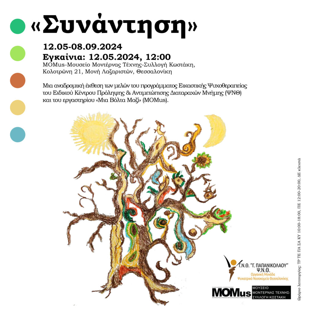 Mε τίτλο «Συνάντηση» ξεκινά την Κυριακή 12 Μαΐου (εγκαίνια ώρα 12μ.μ.) η έκθεση που θα φιλοξενηθεί στο MOMus-ΜΟΥΣΕΙΟ ΜΟΝΤΕΡΝΑΣ ΤΕΧΝΗΣ-ΣΥΛΛΟΓΗ ΚΩΣΤΑΚΗ με έργα των συμμετεχόντων στο πρόγραμμα Εικαστικής Ψυχοθεραπείας που εφαρμόζεται στο Ειδικό Κέντρο Πρόληψης και Αντιμετώπισης Διαταραχών Μνήμης του Ψυχιατρικού Νοσοκομείου Θεσσαλονίκης. Στην έκθεση περιλαμβάνονται έργα από την αρχή σχεδόν της λειτουργίας του Κέντρου το 2002 έως και σήμερα, καθώς και έργα που δημιουργήθηκαν στο Μουσείο, ως αποτέλεσμα της διετούς πλέον συνεργασίας του Κέντρου με το Μουσειακό Πρόγραμμα “Μια Βόλτα Μαζί”.