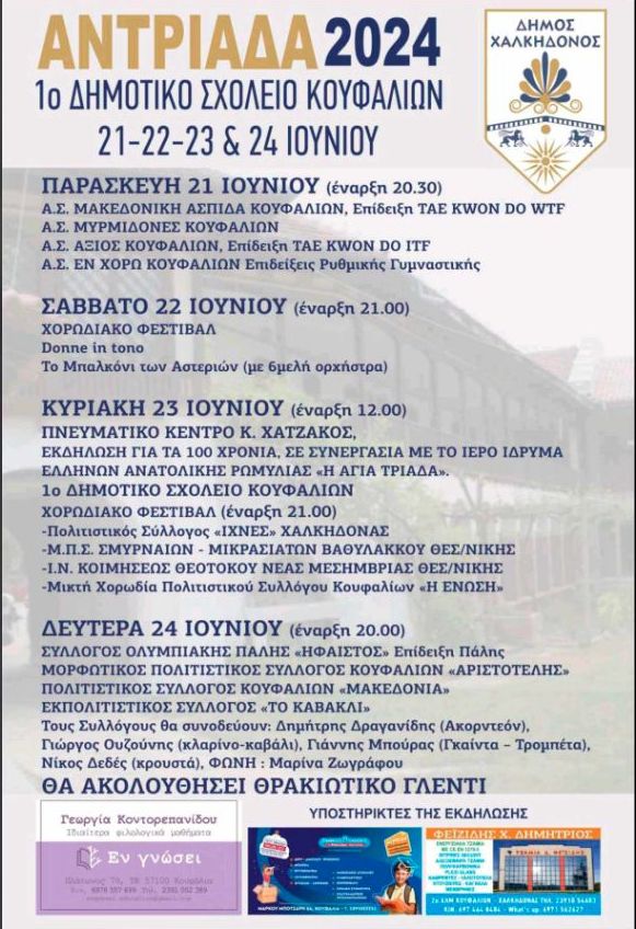 Ιδιαίτερα πλούσιο είναι το φετινό πρόγραμμα της “Αντριάδα 2024” που διοργανώνει ο Δήμος Χαλκηδόνος σε συνεργασία με πολιτιστικούς και αθλητικούς συλλόγους, χορωδίες και σχολές χορού της περιοχής το τετραήμερο 21-24 Ιουνίου στον αύλειο χώρο του 1ου Δημοτικού Σχολείου Κουφαλίων και στο Πνευματικό Κέντρο “Κ. Χατζάκος”.