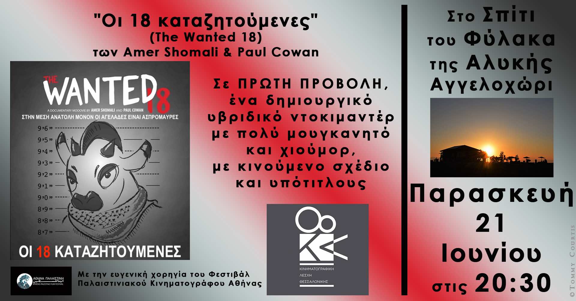 Η Κινηματογραφική Λέσχη Θεσσαλονίκης [ΚΛΘ] και ο Μορφωτικός & Πολιτιστικός Σύλλογος Αγγελοχωρίου, μέσω της ευγενούς χορηγίας του Φεστιβάλ Παλαιστινιακού Κινηματογράφου Αθήνας, παρουσιάζουμε, σε πρώτη προβολή στο Αγγελοχώρι, το αριστοτεχνικό δημιουργικό μετά-ντοκιμαντέρ ΟΙ ΔΕΚΑΟΚΤΩ ΚΑΤΑΖΗΤΟΥΜΕΝΕΣ [2014, 75 λεπτά], των Αμέρ Σομαλί & Πολ Κάουαν, την Παρασκευή 21 Ιουνίου 2024, 8:30μμ, «δίπλα στο κύμα», στο Σπίτι του Φύλακα της Αλυκής [στην παραλία Αγγελοχωρίου, τηλ. 6931-841749]. Την πρώτη φετινή καλοκαιρινή μας προβολή με φόντο το ηλιοβασίλεμα προλογίζει ο κριτικός κινηματογράφου, μέλος της Π.Ε.Κ.Κ., Κώστας Καρδερίνης. Μετά την προβολή ακολουθεί συζήτηση.