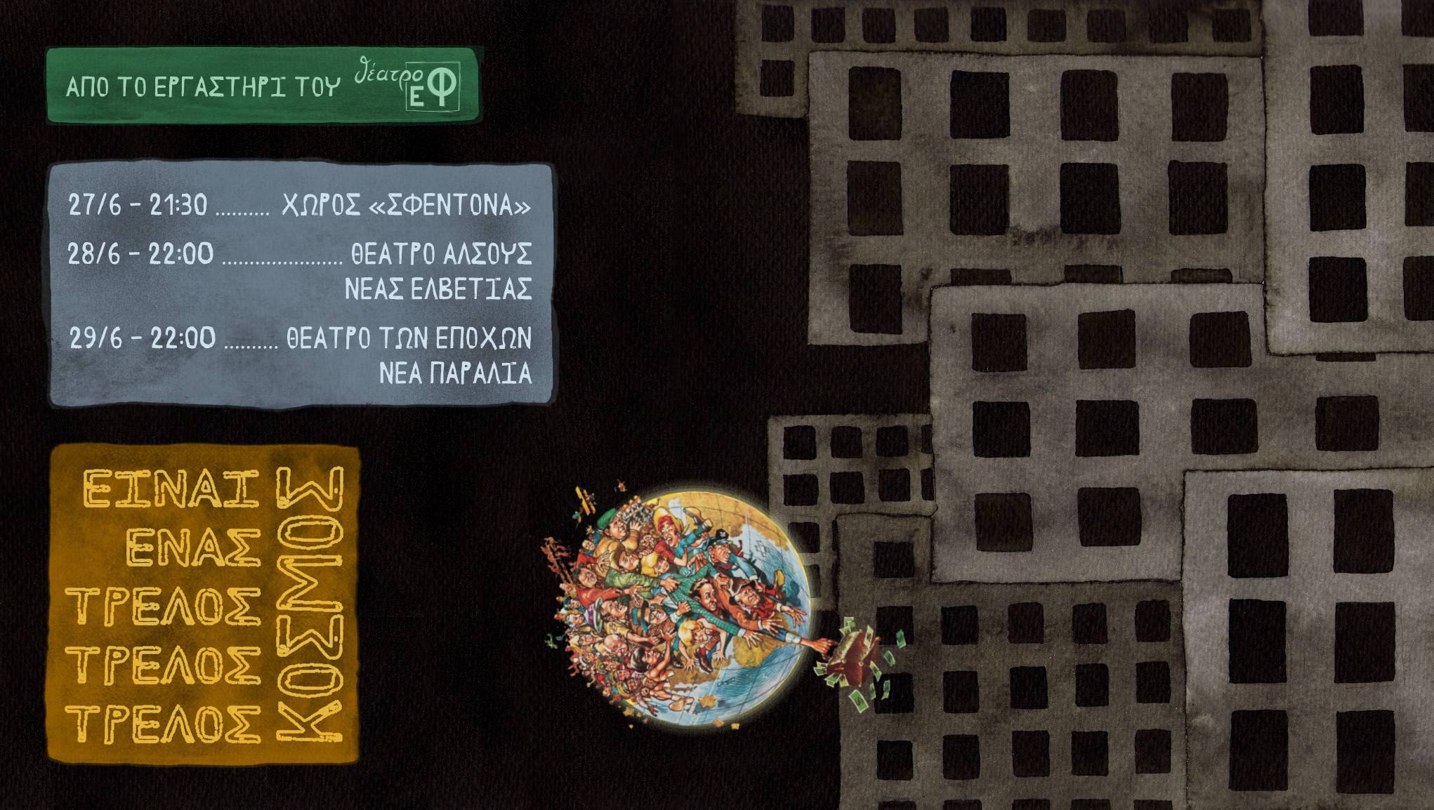 Το εργαστήριο του «θέατρο εΦ» παρουσιάζει μία σύνθεση πρωτότυπων, διασκευασμένων και συλλεχθέντων κειμένων υπό τον τίτλο «Είναι ένας τρελός, τρελός, τρελός κόσμος». Μία παράσταση για τα κοινωνικο-πολιτικο-οικονομικο-κ.α. δεδομένα της ζωής μας που μπορεί όμως να είναι λίγο παράλογα. Μία ομάδα παιδιών που έχουν για σπίτι τους μία χωματερή βλέπουν τον κόσμο των μεγάλων με τον δικό τους ιδιαίτερο τρόπο. Ένα ανεπιθύμητο άλογο και ένα σωρό άλλα «άλογα» που γίνονται όμως πολύ αποδεκτά. Η κοινή λογική στο μικροσκόπιο. Μία απεγνωσμένη απόπειρα να κάνουμε τα κρίματά μας κωμωδία και να γελάσουμε μαζί τους. Συνοδευτικό κείμενο Μία γυναίκα στο Μανχάταν, αναστατώνεται από την ανακάλυψη της πρώτης άσπρης τρίχας μέσα στα μαλλιά της. Ταράζεται. Με αγωνία κολλάει το κεφάλι της πάνω στον καθρέφτη. Γουρλώνει τα μάτια της. Εστιάζει με προσοχή. Προσπαθεί να επιβεβαιώσει – ή μάλλον ελπίζει να ακυρώσει τη διαπίστωσή της. Όχι, δεν υπάρχει καμία άσπρη τρίχα πάνω στο δικό της κεφάλι. Αυτή είναι ακόμα είκοσι (δηλαδή εικοσιοκτώ). Ένα αγόρι σέρνεται στο πλευρό της μητέρας του, που μόλις έχει δεχτεί τα αδέσποτα πυρά ενός βρετανού στρατιώτη στο Αφγανιστάν. Τρέμει από το φόβο. Πιέζει με αγωνία το αίμα μέσα στις πληγές της και τη βαστά με όλη του τη δύναμη. Σκίζει μία λωρίδα ύφασμα από τα ρούχα του, ενώ η μητέρα του ξεψυχάει. Πραγματικά ξεψυχάει. Πεθαίνει. Ένα άψυχο κορμί. Το αγόρι δένει τις πληγές της, παλεύει ακόμα. Από το μυαλό του δε μπορεί καν να περάσει η σκέψη της απώλειας (σε λίγο καιρό θα μάθει να ζει ολομόναχο στα συντρίμμια). Τούτος ο κόσμος μαζί με όλους τους φυσικούς και τεχνητούς νόμους, με τους τόσους κανόνες και την ανελέητη λογική του, παραμένει τόσο … παράλογος. Ταυτότητα παράστασης Σκηνοθεσία: Γιωργής Σφυρής | Κείμενα: Αντώνης Σαμαράκης, Maurice Maeterlinck, Jacques Prévert, Γιωργής Σφυρής | Ηθοποιοί: Αναστασιάδου Μαρία, Αραμπατζή Μεταξία, Δασκάλου Χριστάκη Ρόζα Αντωνία, Μαρινοπούλου Θεοκτίστη, Ντόκου Ανδριάννα, Πασβάντογλου Ελπίδα, Πόπη Ανδρομάχη, Σίμου Σοφία, Σταματόπουλος Κωνσταντίνος, Στυανίδης Αριστοτέλης Περισσότερες πληροφορίες για την ομάδα: https://www.theatroef.gr/ Πρόγραμμα παραστάσεων 27 Ιουνίου στις 21:30 στο Χώρο «Σφεντόνα», Συγγρού 24, στην ταράτσα (απαραίτητη η κράτηση θέσης) 28 Ιουνίου στις 22:00 στο Θέατρο Άλσους Νέας Ελβετίας 29 Ιουνίου στις 22:00 στο Θέατρο των Εποχών στη Νέα Παραλία Διάρκεια: 1 ώρα | Είσοδος Ελεύθερη ΠΡΟΣΟΧΗ: Για την παράσταση στο Χώρο Νεολαίας και Πολιτισμού «Σφεντόνα» είναι απαραίτητη η κράτηση θέσης στο 6948533067.