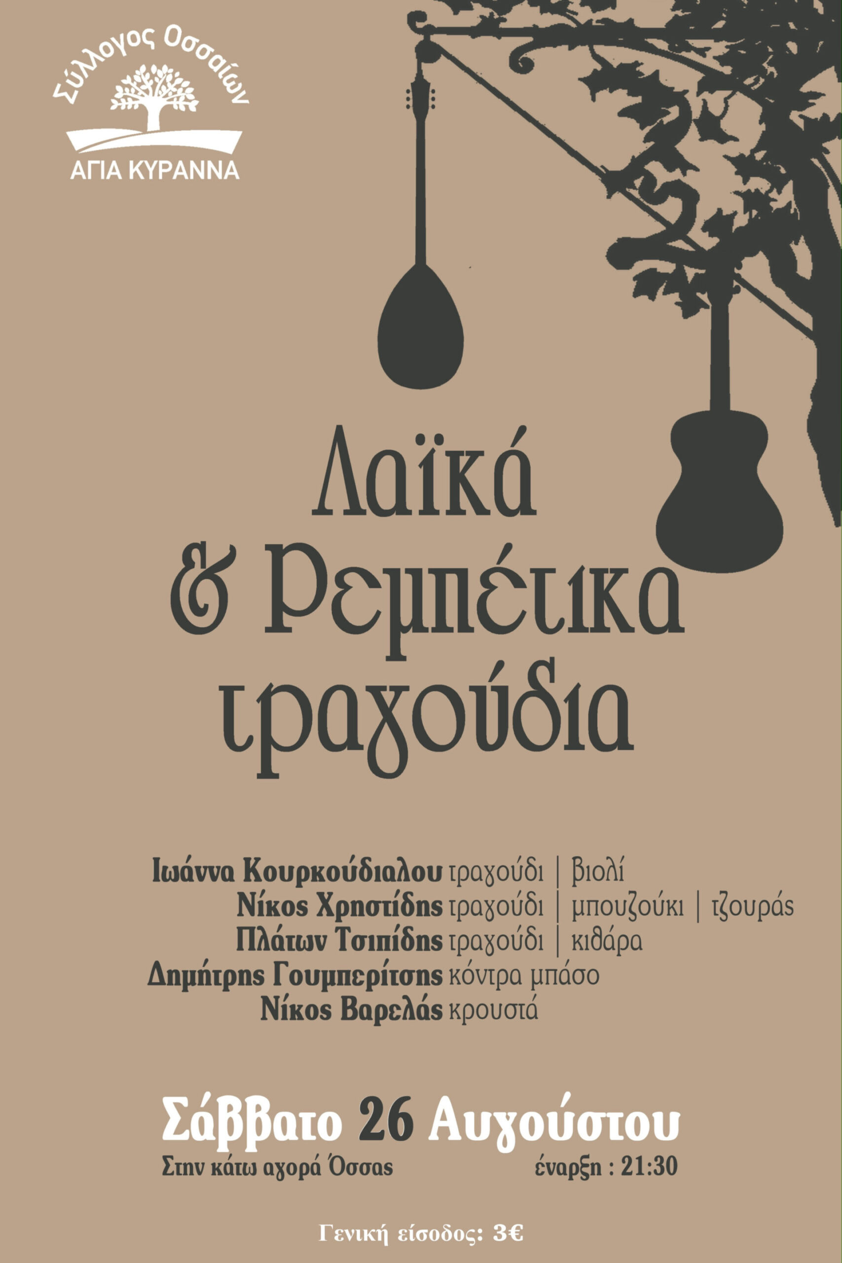 Ο Σύλλογος Οσσαίων «Η Αγία Κυράννα» σας προσκαλεί σε μια όμορφη μουσική βραδιά, το Σάββατο 26 Αυγούστου 2023 και ώρα 9.30 μ.μ., στην Κάτω Αγορά της Όσσας. Μαζί μας μια όμορφη παρέα καταξιωμένων μουσικών που θα μας κρατήσουν συντροφιά με γνωστά έντεχνα, λαϊκά και ρεμπέτικα τραγούδια.