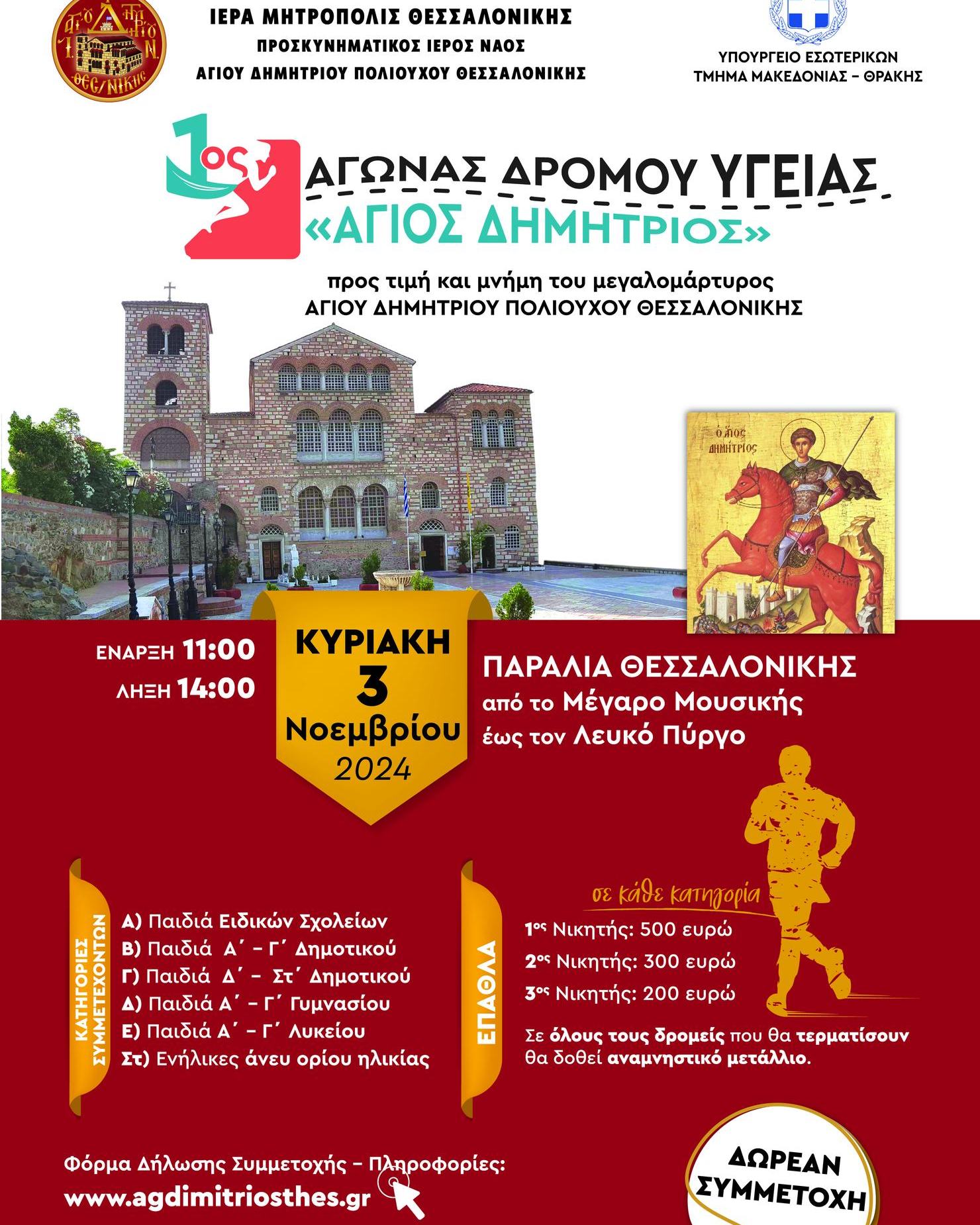 Ο 1ος Αγώνας Δρόμου Υγείας “Άγιος Δημήτριος” που διοργανώνει η Ιερά Μητρόπολις Θεσσαλονίκης και ο Ιερός Ναός Αγίου Δημητρίου Πολιούχου Θεσσαλονίκης, απευθύνεται σε όλους και όλες ανεξαρτήτου ορίου ηλικίας, ενώ η συμμετοχή στους αγώνες δρόμου είναι δωρεάν.