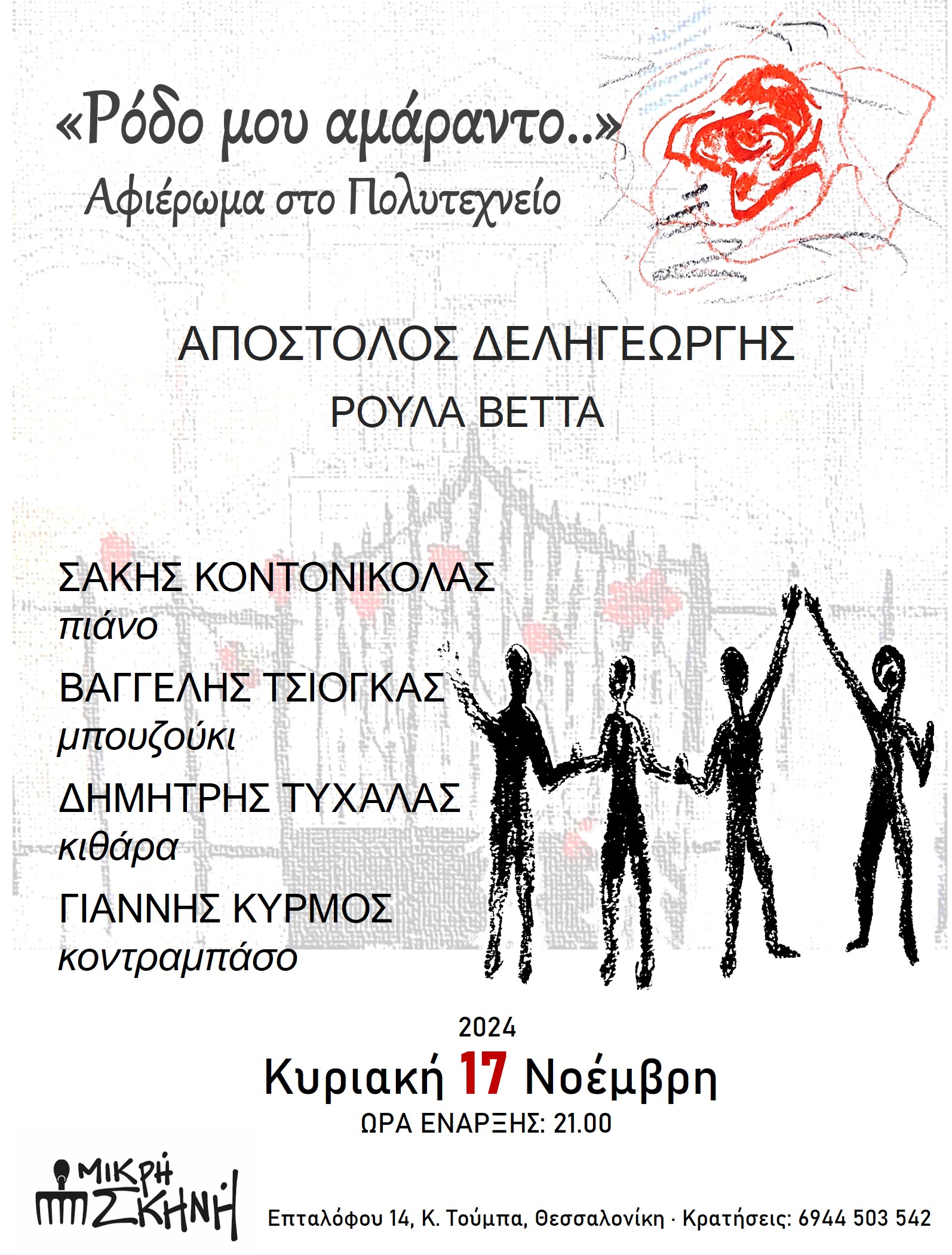 Αφιέρωμα στο Πολυτεχνείο με τίτλο “Ρόδο μου αμάραντο” θα γίνει την Κυριακή 17 Νοεμβρίου στις 21.00, στη Μικρή Σκηνή, στην Κ. Τούμπα, από τον Απόστολο Δεληγεώργη και την παρέα εξαιρετικών μουσικών της πόλη μας.