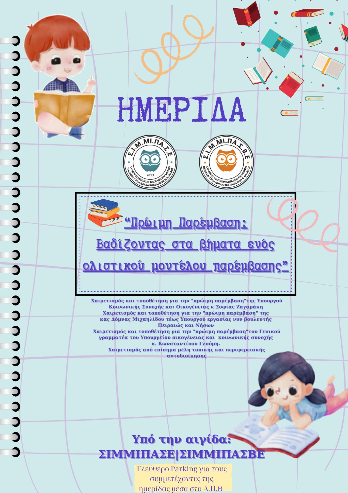 Ο ΣΙΜΜΙΠΑΣΒΕ (Συλλογος Μικρών και Μεγάλων Παιδικών Σταθμών Βορείου Ελλάδος) σε συνεργασία με τον ΣΙΜΜΙΠΑΣΕ (Συλλογος Μικρών και Μεγάλων Παιδικών Σταθμών Ελλάδος) διοργανώνουν το Σάββατο 23/11 στις 10.00 στην αίθουσα εκδηλώσεων της βιβλιοθήκης του ΑΠΘ την επιστημονική ημερίδα με θέμα ‘ Η πρώιμη παρέμβαση στην προσχολική ηλικία’.