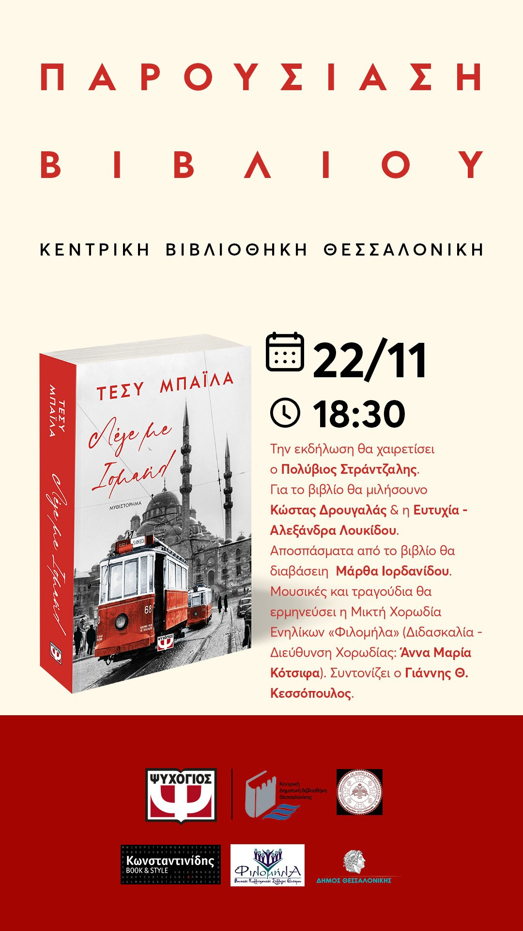 Η Κεντρική Βιβλιοθήκη του Δήμου Θεσσαλονίκης, η «Ένωσις Ομογενών εκ Κωνσταντινουπόλεως Βορείου Ελλάδος» και οι εκδόσεις Ψυχογιός παρουσιάζουν το ιστορικό – κοινωνικό μυθιστόρημα «Λέγε με Ισμαήλ» της Τέσυς Μπάιλα, την Παρασκευή 22 Νοεμβρίου 2024, στις 6.30 μ.μ. στην Αίθουσα Εκδηλώσεων της Κεντρικής Βιβλιοθήκης Θεσσαλονίκης (Εθν. Αμύνης 27, 2ος όροφος).