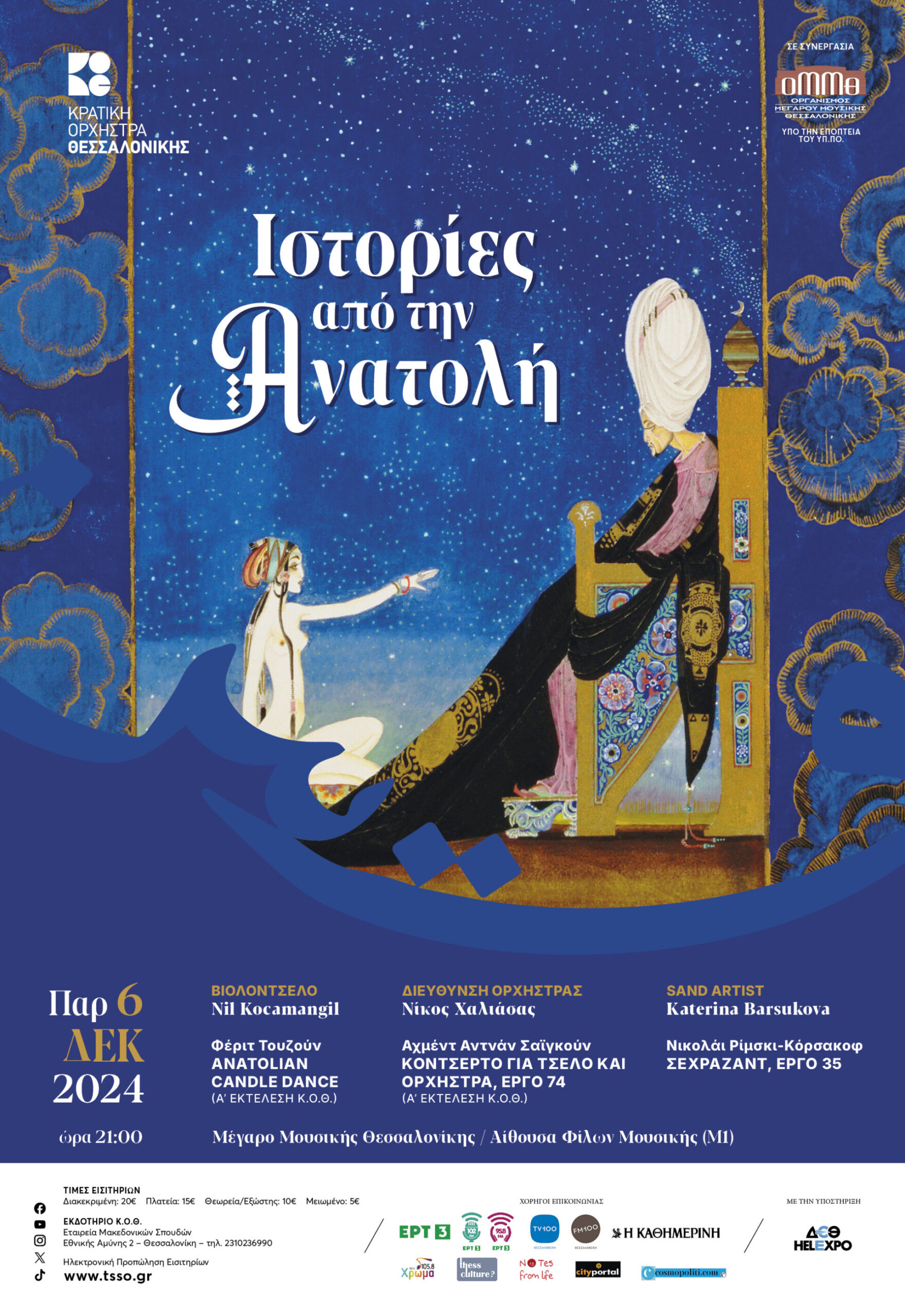 Η Κρατική Ορχήστρα Θεσσαλονίκης διηγείται υπέροχες ιστορίες από την Ανατολή, μέσα από έργα Τούρκων συνθετών του περασμένου αιώνα, όπως οι Φέριτ Τουζούν και Αχμέντ Αντνάν Σαϊγκούν, αλλά και την παραμυθένια ‘Σεχραζάτ’ του Ρίμσκι-Κόρσακοφ. Συμπράττει η κορυφαία Τουρκάλα τσελίστρια Nil Kocamangil, που έχει ιδρύσει και διευθύνει μεταξύ άλλων την Διεθνή Μουσική Ακαδημία της Κωνσταντινούπολης και το Διεθνές Φεστιβάλ Μουσικής Δωματίου της Κωνσταντινούπολης, ενώ την Κ.Ο.Θ. διευθύνει ο Νίκος Χαλιάσας.