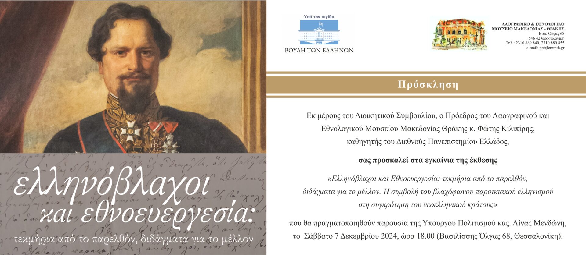 Το Λαογραφικό & Εθνολογικό Μουσείο Μακεδονίας – Θράκης (ΛΕΜΜ-Θ) παρουσιάζει τη νέα περιοδική του έκθεση με τον τίτλο «Ελληνόβλαχοι και Εθνοευεργεσία: τεκμήρια από το παρελθόν – διδάγματα για το μέλλον, Η συμβολή του βλαχόφωνου παροικιακού ελληνισμού στη συγκρότηση του νεοελληνικού κράτους»