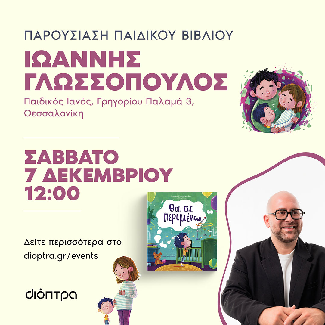 Το Σάββατο 7 Δεκεμβρίου, ώρα 12.00 η Αλυσίδα Πολιτισμού IANOS και οι Εκδόσεις Διόπτρα Διοργανώνουν την παρουσίαση του παιδικού βιβλίου του Ιωάννη Γλωσσόπουλου με τίτλο «Θα σε περιμένω».