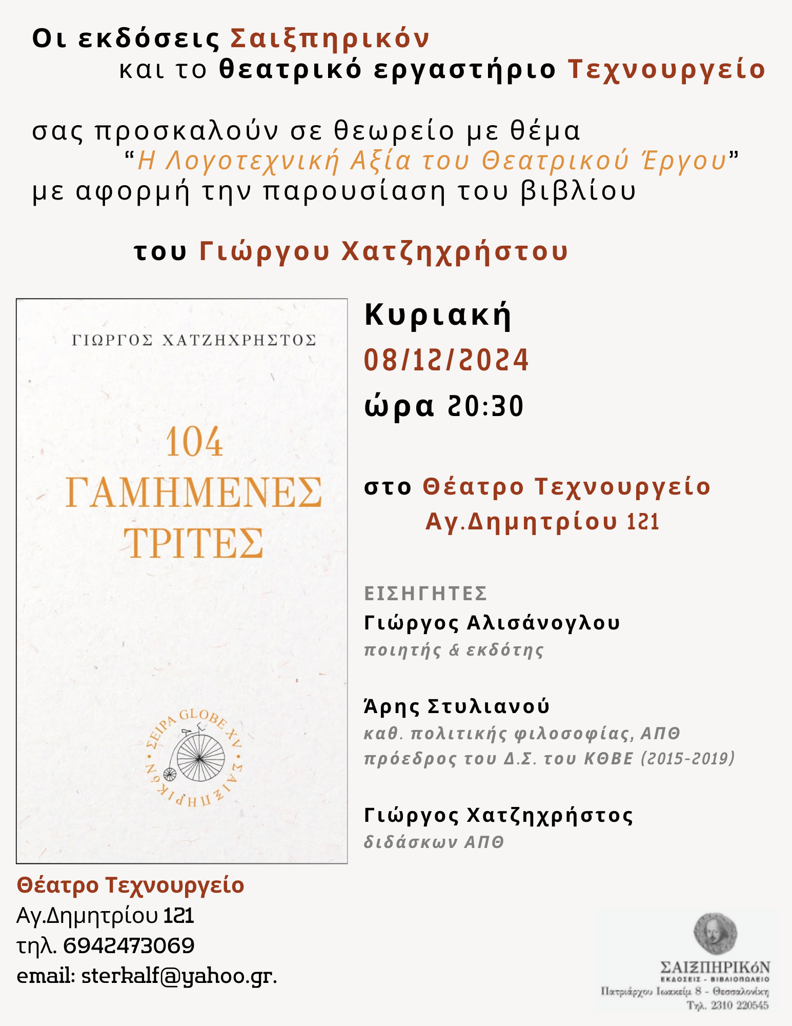Την Κυριακή 08 Δεκεμβρίου στις 20:30 οι εκδόσεις Σαιξπηρικόν και το θεατρικό εργαστήριο Τεχνουργείο σας καλούν στην παρουσίαση του θεατρικού έργου του Γιώργου Χατζηχρήστου, με τίτλο «104 Γαμημένες Τρίτες».