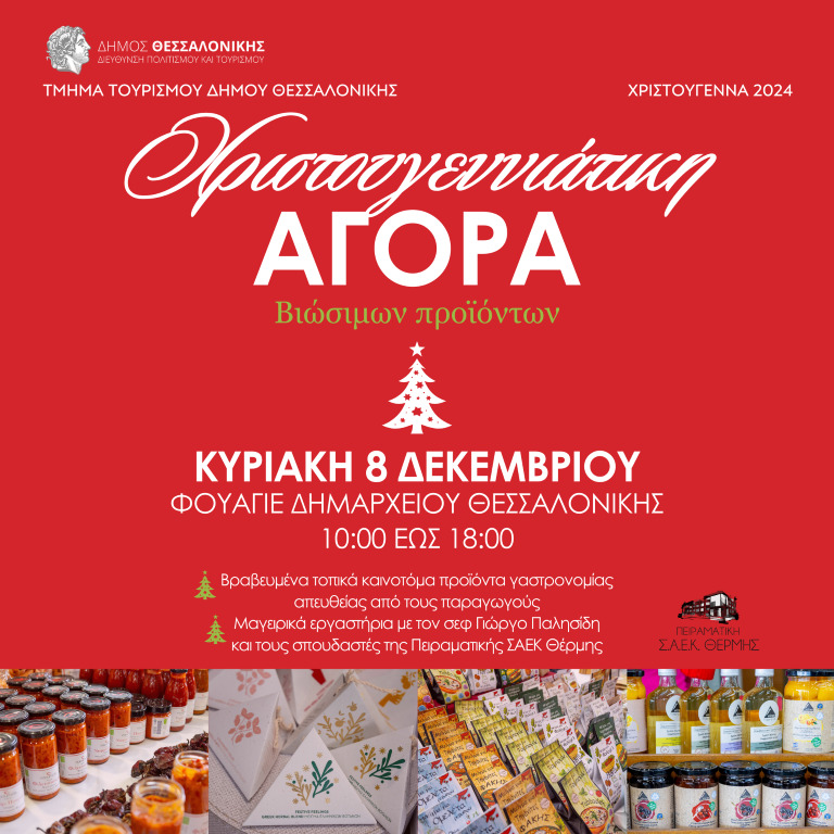 Το Τμήμα Τουρισμού του Δήμου Θεσσαλονίκης, μας προσκαλεί, στην Χριστουγεννιάτικη αγορά βιώσιμων προϊόντων, για να στρώσουμε το εορταστικό τραπέζι, την Κυριακή 8 Δεκεμβρίου από τις 10.00 έως τις 18.00, στο φουαγιέ του δημαρχείου Θεσσαλονίκης.