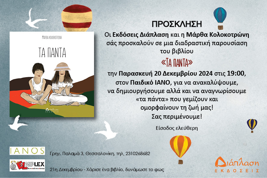 Την Παρασκευή 20 Δεκεμβρίου, στις 19:00 η Αλυσίδα Πολιτισμού IANOS και οι εκδόσεις «Διάπλαση» διοργανώνουν μια διαδραστική παρουσίαση του βιβλίου της Μάρθας Κολοκοτρώνη, με τίτλο «Τα Πάντα».