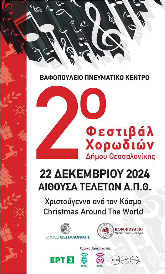 Το Βαφοπούλειο Πνευματικό Κέντρο του Δήμου Θεσσαλονίκης διοργανώνει το 2ο Φεστιβάλ Χορωδιών το οποίο καθιερώνεται ως θεσμός. Το Φεστιβάλ Χορωδιών με τίτλο «Christmas around the world» (Χριστούγεννα ανά τον Κόσμο) θα πραγματοποιηθεί την Κυριακή 22 Δεκεμβρίου 2024, στην Αίθουσα Τελετών του Αριστοτελείου Πανεπιστημίου Θεσσαλονίκης, από τις 12:00 έως τις 14:30 και από τις 18:30 έως τις 20:30.