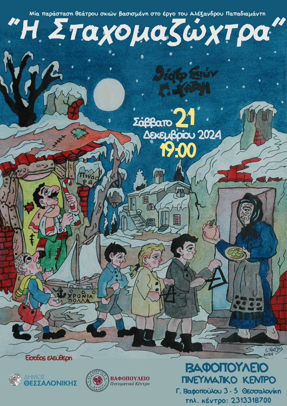 Το Βαφοπούλειο Πνευματικό Κέντρο διοργανώνει το Σάββατο 21 Δεκεμβρίου 2024 την παράσταση θεάτρου σκιών «Η Σταχομαζώχτρα», βασισμένη στο ομότιτλο διήγημα του Αλέξανδρου Παπαδιαμάντη, με τον Γιάννη Χατζή.