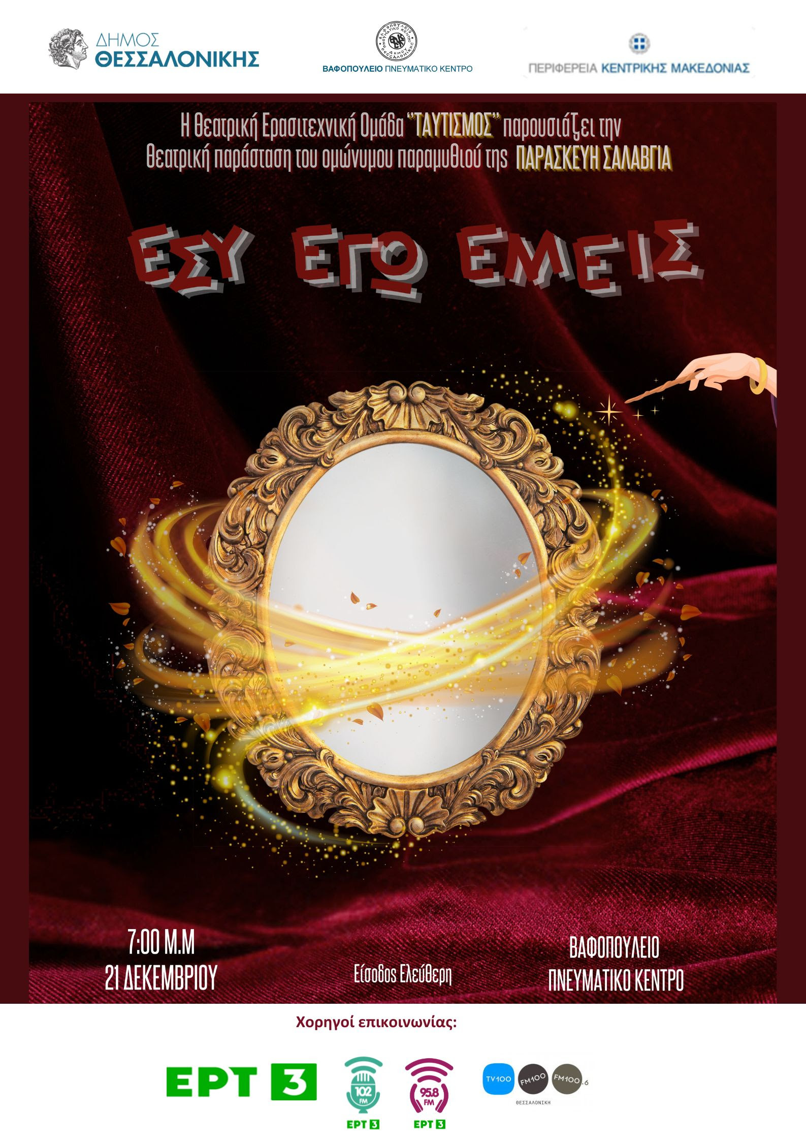 Το Βαφοπούλειο Πνευματικό Κέντρο του Δήμου Θεσσαλονίκης σε συνεργασία με την Περιφέρεια Κεντρικής Μακεδονίας και τη Θεατρική Ερασιτεχνική Ομάδα «Ταυτισμός» του Συλλόγου «Μιλάμε για τον Αυτισμό» παρουσιάζουν την παράσταση «Εσύ, εγώ, εμείς». Η εκδήλωση θα πραγματοποιηθεί στις 21 Δεκεμβρίου 2024, στις 19:00, στο Βαφοπούλειο Πνευματικό Κέντρο (Γ. Βαφόπουλου 3-5), με ελεύθερη είσοδο για το κοινό.