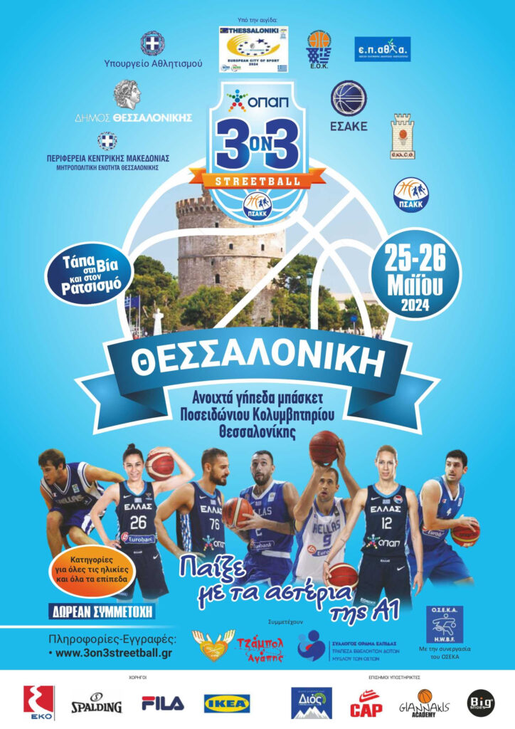 Ο Δήμος Θεσσαλονίκης, το Τμήμα Εκδηλώσεων και Προγραμμάτων Αθλητισμού της Διεύθυνσης Αθλητισμού & Εθελοντισμού, διοργανώνει Τουρνουά Μπάσκετ 3on3 StreetBall για όλους, με σύνθημα «Τάπα στη Βία και στο Ρατσισμό», σε συνεργασία με τον Πανελλήνιο Σύνδεσμο Αμειβομένων Καλαθοσφαιριστών (ΠΣΑΚ), την EOK, τον EΣΑΚΕ και την ΕΚΑΣΘ, το Σάββατο 25 & Κυριακή 26 Μαΐου 2024, στο χώρο του Ποσειδωνίου Αθλητικού Κέντρου, κατά τις ώρες 09:00- 14:00 & 17:00 – 20:00. Οι ομάδες συνεχίζουν να παίζουν όσο κερδίζουν, αλλά και να χάσουν μία φορά συνεχίζουν με το σύστημα νταμπλ – νοκ άουτ. Αξίζει να σημειωθεί ότι οι συμμετέχοντες θα έχουν την ευκαιρία να παίξουν, να διασκεδάσουν να συναγωνιστούν και ταυτόχρονα να δουν και να γνωρίσουν από κοντά τα ινδάλματά τους (διεθνείς και επίλεκτους αθλητές της Α1 κατηγορίας). Ακόμη, στο πλαίσιο του τουρνουά, θα γίνουν διαγωνισμοί τριπόντων, ελευθέρων βολών κ.λ.π. και θα μοιραστούν δώρα.