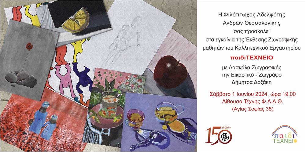 Η Φιλόπτωχος Αδελφότης Ανδρών Θεσσαλονίκης σας προσκαλεί στα εγκαίνια της Έκθεσης Ζωγραφικής μαθητών του Καλλιτεχνικού Εργαστηρίου παιδιΤΕΧΝΕΙΟ με δασκάλα ζωγραφικής την Εικαστικό-Ζωγράφο Δήμητρα Δοξάκη το Σάββατο 1 Ιουνίου 2024, ώρα 19.00 στην Αίθουσα Τέχνης της Φ.Α.Α.Θ. (Αγίας Σοφίας 38).