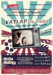ΚΑΤΙ ΑΠ’ ΤΑ ΠΑΛΙΑ ένα νοσταλγικό ταξίδι στο ελληνικό τραγούδι. Οι θεατρικές ομάδες του Δήμου «Αλτερέγκο» και ‘Banoffi” παρουσιάζουν τη μουσικοθεατρική παράσταση «ΚΑΤΙ ΑΠ’ ΤΑ ΠΑΛΙΑ’ ένα νοσταλγικό ταξίδι στο ελληνικό τραγούδι με ζωντανή ορχήστρα και χορευτές επί σκηνής. Σας προσκαλούμε την Κυριακή 22 & 23/9 και ώρα 8.30 μ.μ. στον αύλειο χώρο της Δημοτικής Βιβλιοθήκης Αμπελοκήπων «ΑΡΙΣΤΟΤΕΛΕΙΟΣ» (Φιλιππουπόλεως με Μ.Αλεξάνδρου).