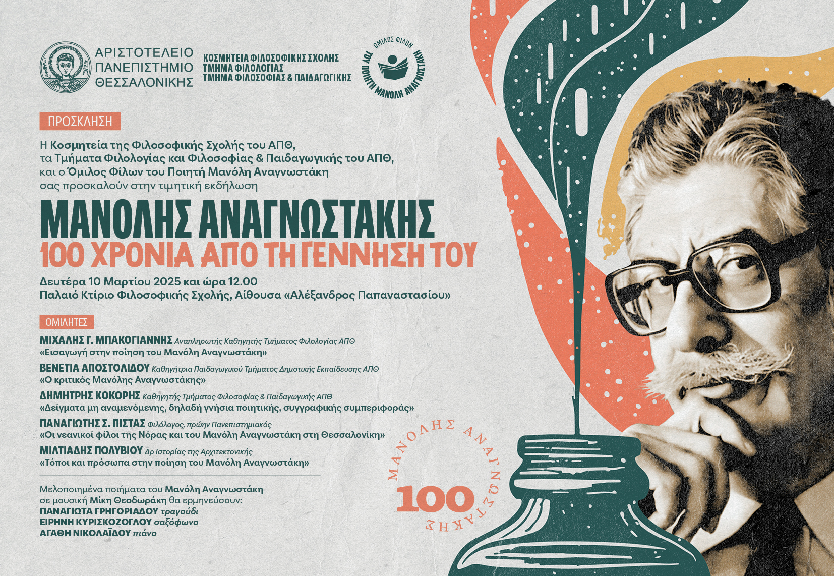 Σημειώνεται πως η παραπάνω δράση εντάσσεται στον κύκλο εκδηλώσεων του Ομίλου «Μιλούμε για τον Μανόλη Αναγνωστάκη – 100 χρόνια από τη γέννησή του».
