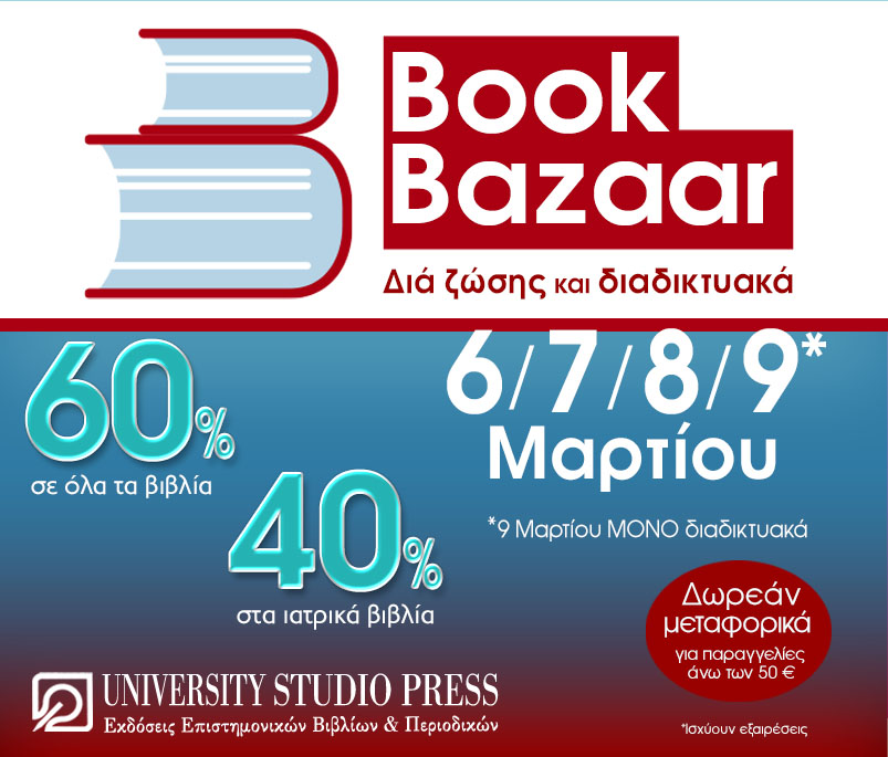 Για ακόμη μία χρονιά οι Εκδόσεις Επιστημονικών Βιβλίων και Περιοδικών, University Studio Press, προσφέρει με μεγάλη έκπτωση τους τίτλους της. Θα υπάρξει έκπτωση 60% σε όλα τα βιβλία, 40% σε όλα τα ιατρικά βιβλία.