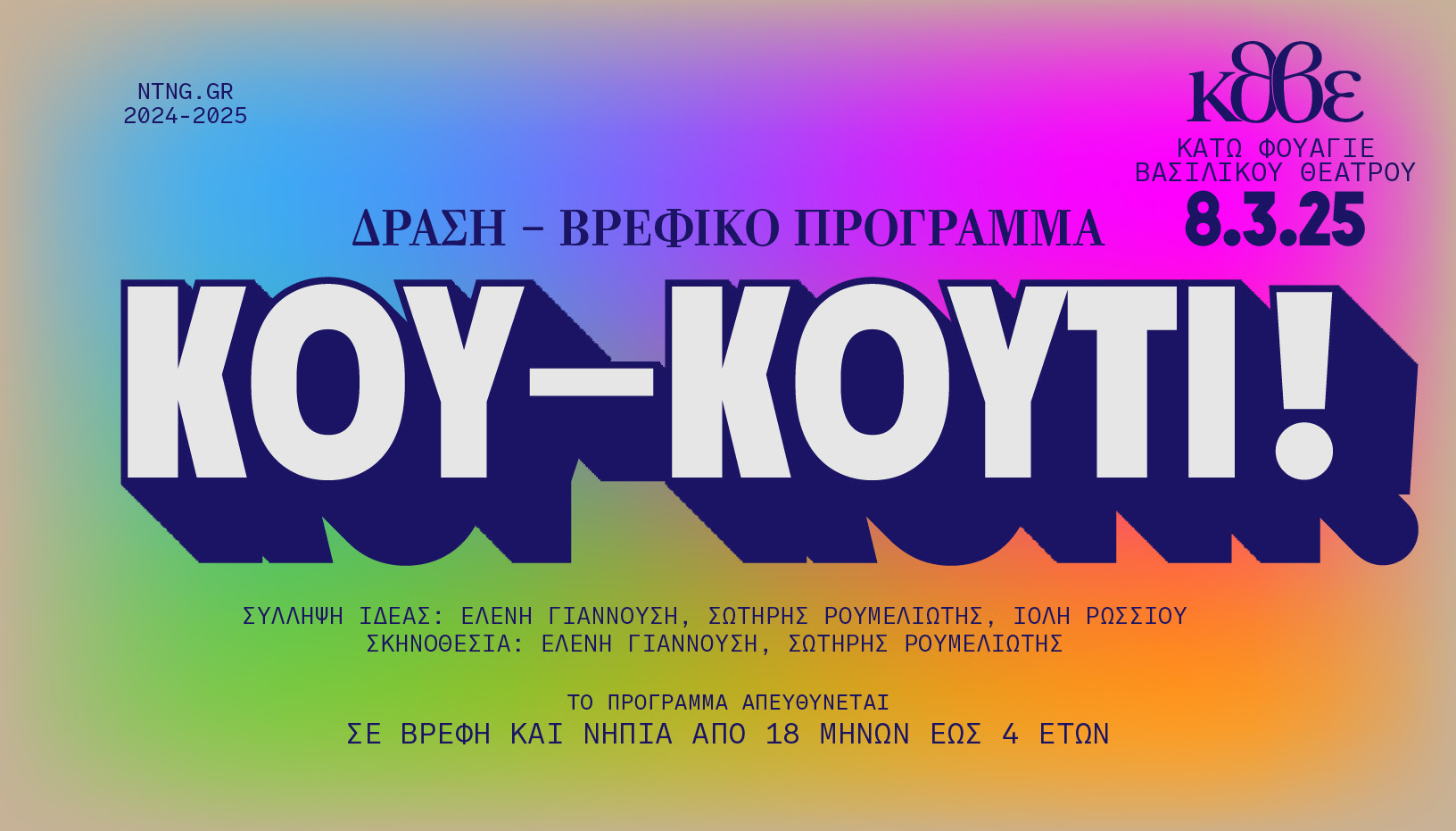 Το «Κου-κουτί!» απευθύνεται σε παιδιά από 18 μηνών έως 4 ετών και… έρχεται από το Σάββατο 8 Μαρτίου, και για λίγες παραστάσεις, στο Κάτω φουαγιέ (-1) του Βασιλικού Θεάτρου.