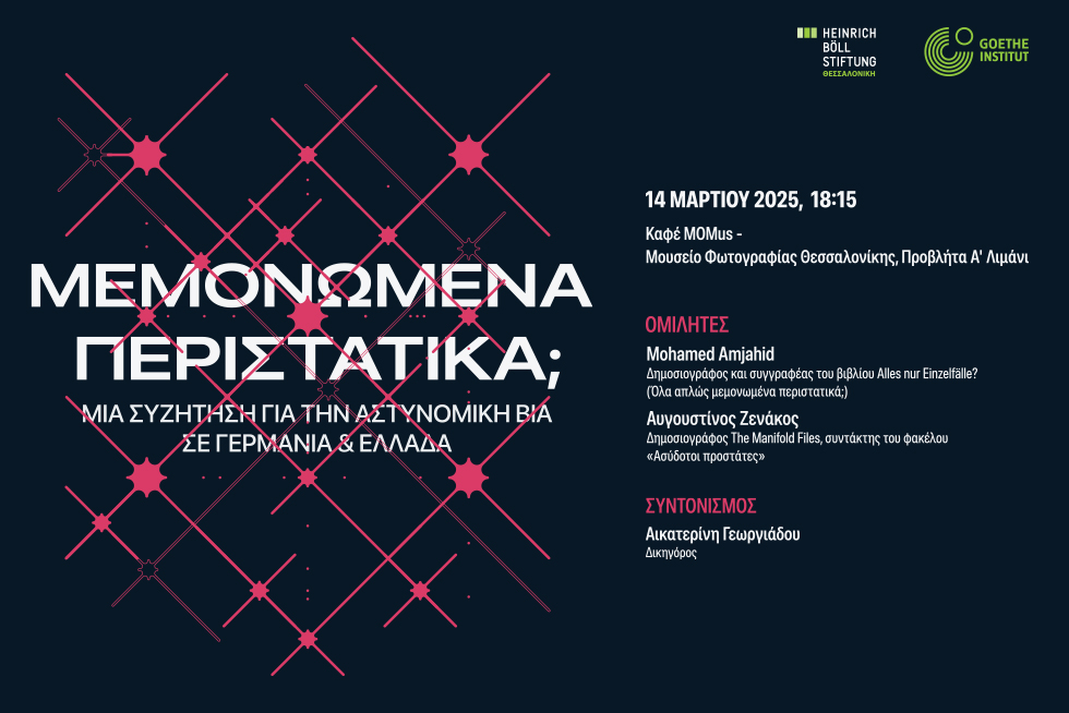 Τα παραπάνω πρόκειται να συζητηθούν σε εκδήλωση που διοργανώνουν το Ίδρυμα Χάινριχ Μπελ – Γραφείο Θεσσαλονίκης και το Goethe-Institut Thessaloniki, την Παρασκευή 14 Μαρτίου 2025 στις 18:30, στο καφέ του MOMus-Μουσείου Φωτογραφίας Θεσσαλονίκης (Προβλήτα Α’, Λιμάνι). Κεντρικός καλεσμένος είναι ο δημοσιογράφος και συγγραφέας Mohamed Amjahid, ο οποίος στο βιβλίο του “Alles nur Einzelfälle?” (Όλα απλώς μεμονωμένα περιστατικά;) αναλύει μέσα από την έρευνά του τη συστημική φύση της αστυνομικής βίας, τις καταχρήσεις και τις συγκαλύψεις των παραβιάσεων αυτών στη Γερμανία. Μαζί του στο πάνελ θα βρίσκεται ο Αυγουστίνος Ζενάκος, δημοσιογράφος και συνιδρυτής του Manifold Files, ο οποίος, σε συνεργασία με την υπόλοιπη ομάδα του Manifold, έχει ερευνήσει περιστατικά αστυνομικής αυθαιρεσίας στην Ελλάδα, παρέχοντας, μέσα από τον φάκελο «Ασύδοτοι προστάτες», τεκμήρια και δεδομένα για το θέμα αυτό, που αποτελεί τελικά ζήτημα δημοκρατίας. Τη συζήτηση συντονίζει η δικηγόρος Αικατερίνη Γεωργιάδου.