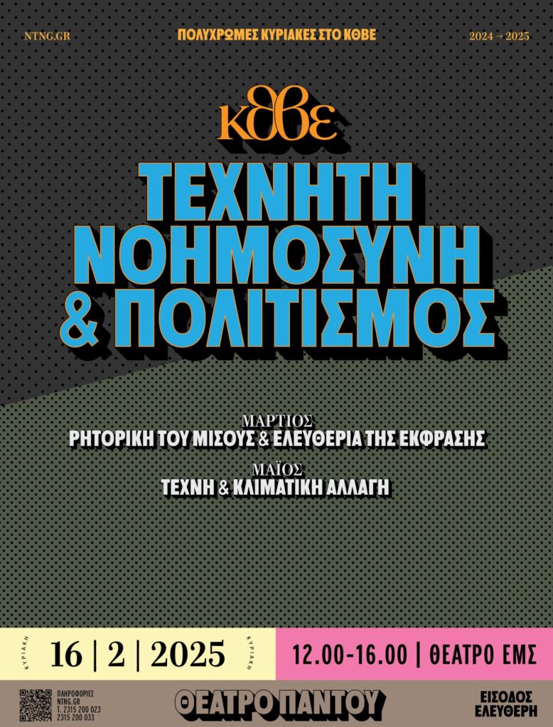 Την Κυριακή 16 Φεβρουαρίου το Κρατικό Θέατρο Βορείου Ελλάδος ανοίγει τις πόρτες του στο κοινό της πόλης, με μια σειρά δράσεων εστιασμένων στην τεχνητή νοημοσύνη. Η πρώτη Πολύχρωμη Κυριακή στο ΚΘΒΕ για το 2025, με τίτλο «Τεχνητή Νοημοσύνη & Πολιτισμός» θα πραγματοποιηθεί σε χώρους του Θεάτρου της Εταιρείας Μακεδονικών Σπουδών. Σε μια ιστορική στιγμή που η ανθρωπότητα με τη βοήθεια της τεχνητής νοημοσύνης οδεύει προς ένα τεράστιο τεχνολογικό άλμα, το οποίο μας φέρνει μπροστά σε νέες πραγματικότητες, το ΚΘΒΕ αφιερώνει μια ημέρα ενημέρωσης, συμμετοχής και διαλόγου, πάνω στις σύγχρονες αυτές τεχνολογικές εξελίξεις.