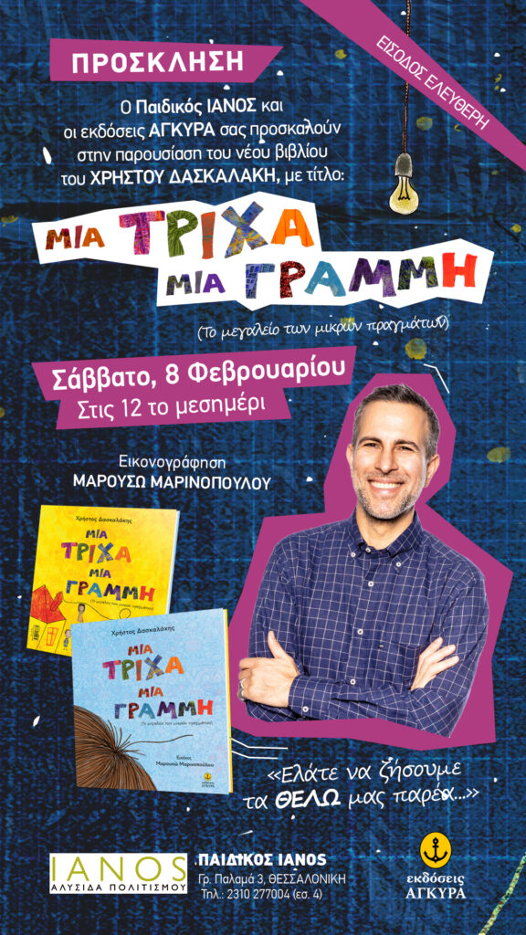 Το Σάββατο 8 Φεβρουαρίου Εκδόσεις Άγκυρα παρουσίαση του παιδικού βιβλίου του Χρήστου Δασκαλάκη, με τίτλο «Μια τρίχα μια γραμμή».