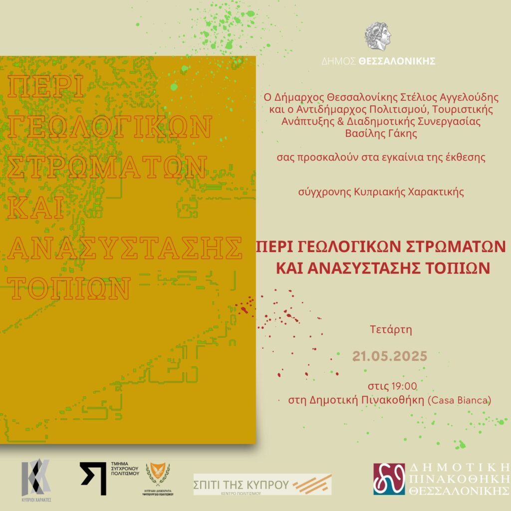 Εγκαινιάζεται την Τετάρτη 21 Μαΐου 2025 και ώρα 19:00, στη Δημοτική Πινακοθήκη Θεσσαλονίκης – κτίριο Casa Bianca η ομαδική έκθεση χαρακτικής «Περί Γεωλογικών Στρωμάτων και ανασύστασης τοπίων», με έργα σύγχρονων χαρακτών που ζουν και δραστηριοποιούνται στη Κύπρο.