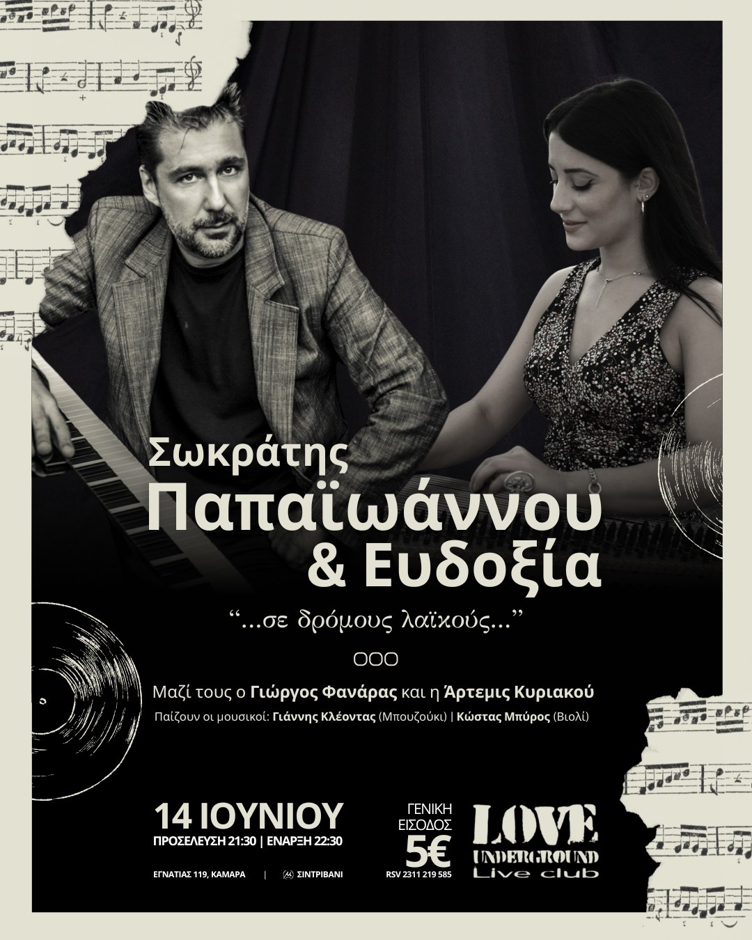 Ο Θεσσαλονικιός τραγουδοποιός Σωκράτης Παπαϊωάννου και η ξεχωριστή ερμηνεύτρια Ευδοξία ανοίγουν τις καλοκαιρινές τους εμφανίσεις από τη σκηνή του LOVE Underground με ένα λαϊκό μουσικό πρόγραμμα γεμάτο συναίσθημα, ένταση και εξωστρέφεια.