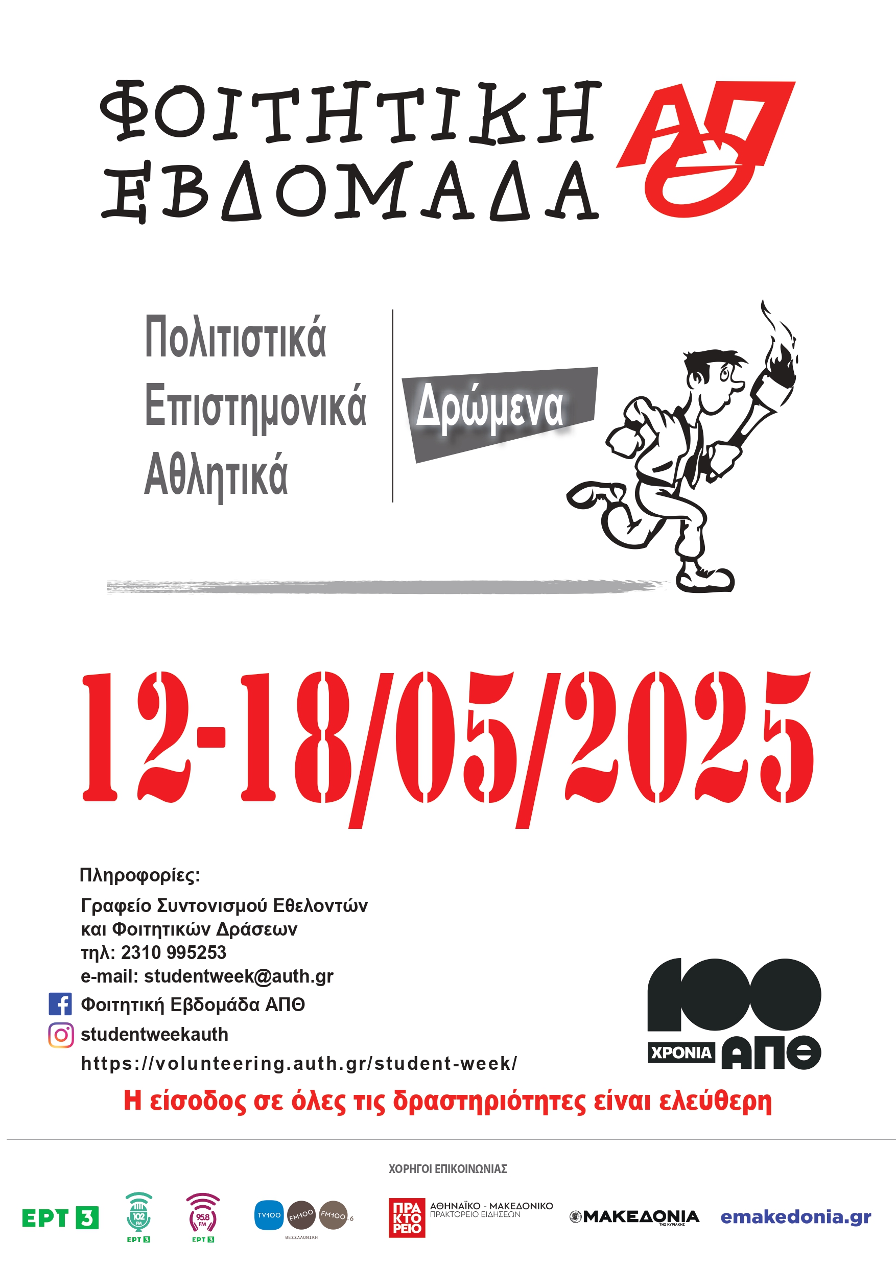 12 έως 18 Μαΐου | Είσοδος ελεύθερη | Περισσότερες πληροφορίες στα social media της Φοιτητικής Εβδομάδας: Φοιτητική Εβδομάδα ΑΠΘ @studentweekauth