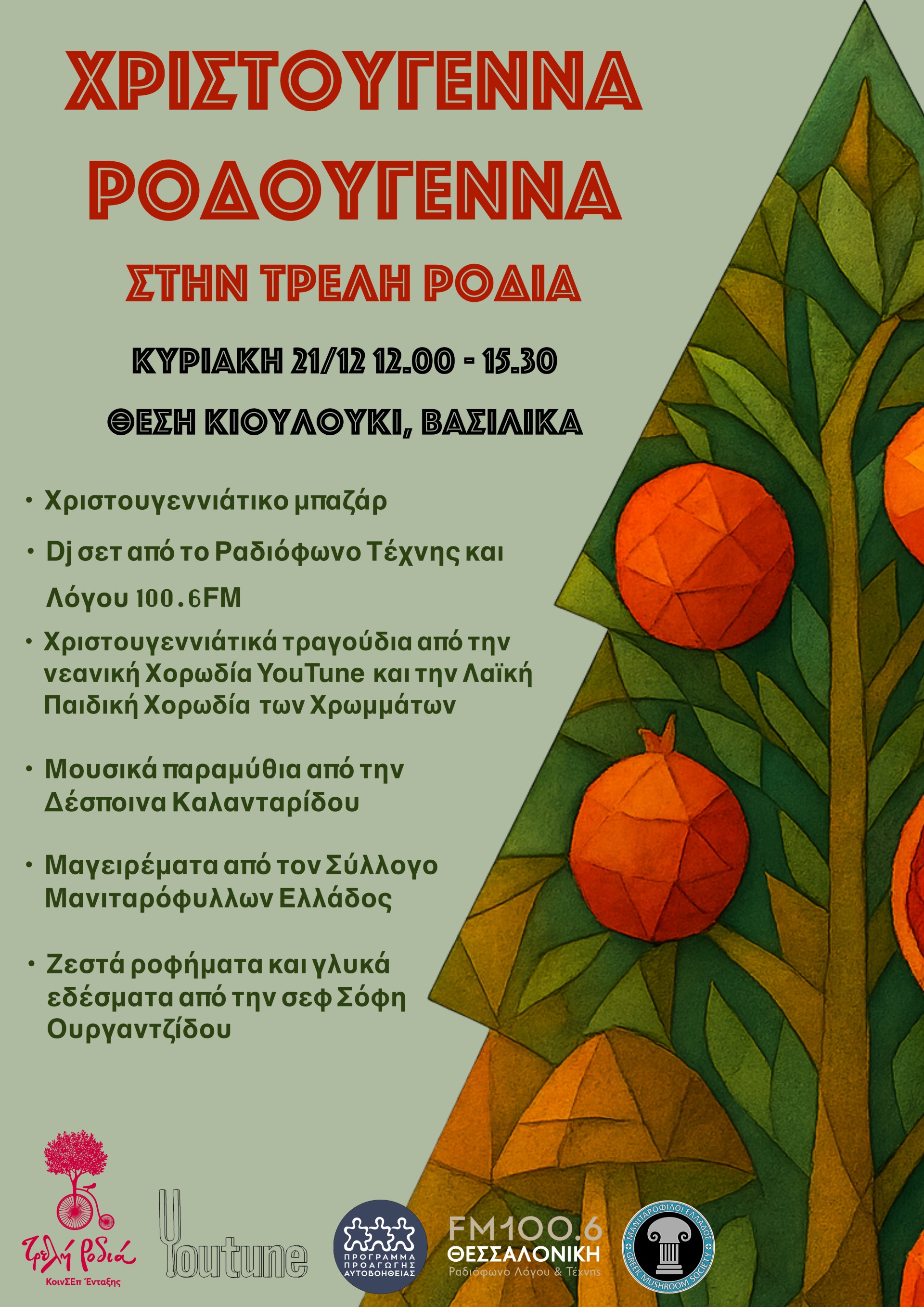 Η Τρελή Ροδιά Κοιν.Σ.Επ. Ένταξης διοργανώνει την Κυριακή 21 Δεκεμβρίου 2025, από τις 12.00 έως τις 15.30, τη χριστουγεννιάτικη γιορτή με τίτλο «Χριστούγεννα Ροδούγεννα στην Τρελή Ροδιά», στις εγκαταστάσεις της, στη θέση Κιουλούκι, Βασιλικά. Η εκδήλωση πραγματοποιείται με σκοπό την ενίσχυση και υποστήριξη της Κοιν.Σ..Επ. Ένταξης Τρελή Ροδιά.