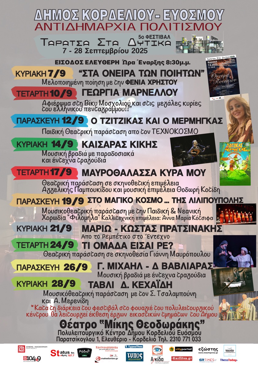 Θεσμό στα πολιτιστικά δρώμενα του Δήμου Κορδελιού-Ευόσμου αποτελεί πλέον το φεστιβάλ «Ταράτσα στα Δυτικά», το οποίο περιλαμβάνει σειρά εκδηλώσεων, ανοίγει τις «πύλες» του την Κυριακή 7 Σεπτεμβρίου και θα διαρκέσει μέχρι τις 28 του μήνα.