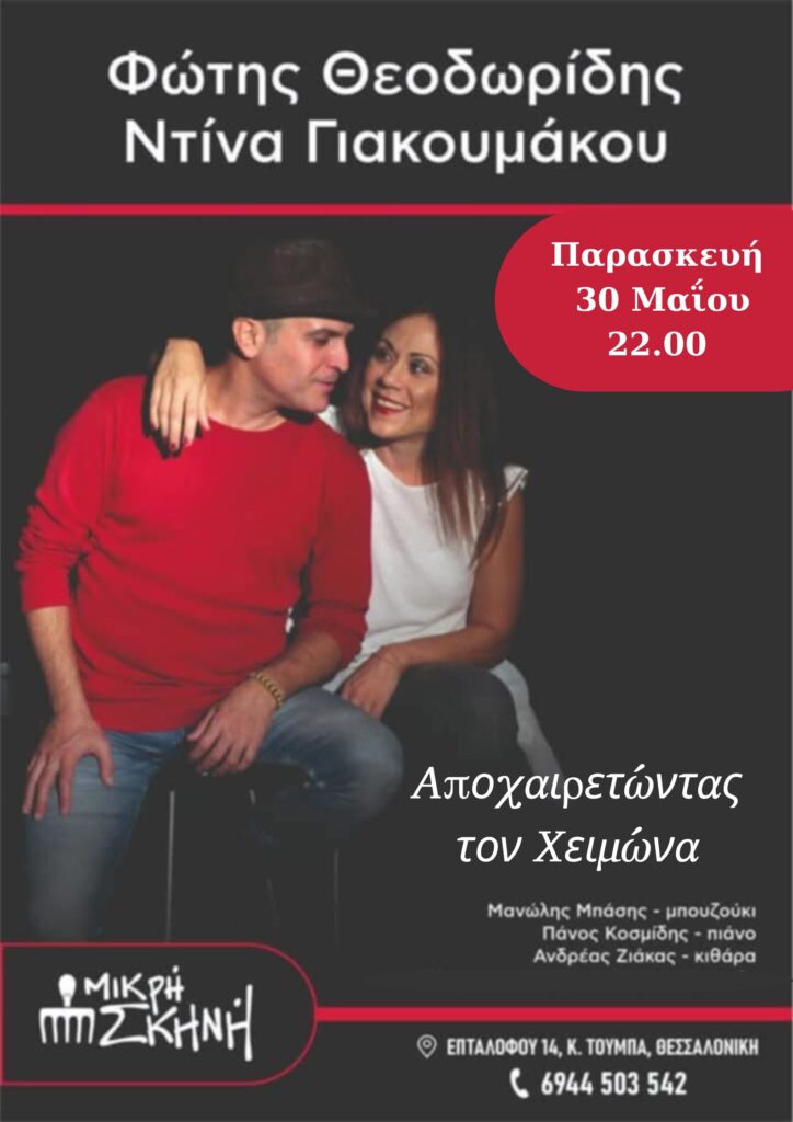 Ο Φώτης Θεοδωρίδης και η Ντίνα Γιακουμάκου, πιστοί στο ραντεβού τους στη Μικρή Σκηνή, έρχονται την Παρασκευή 30 Μαΐου να αποχαιρετήσουμε τον χειμώνα και να μας χαρίσουν ένα ακόμα λαϊκό γλέντι όπως εκείνοι μόνο ξέρουν!