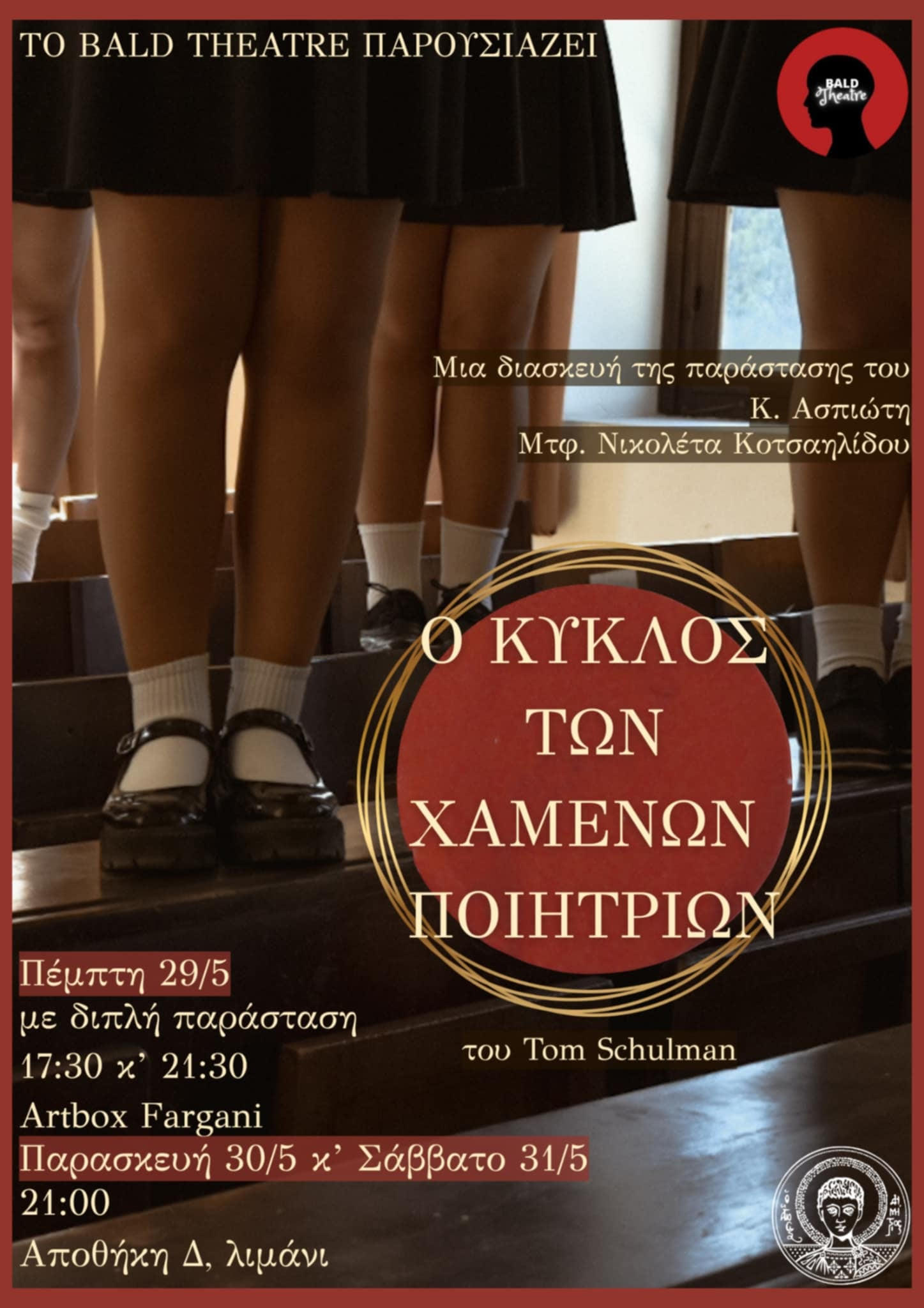 Η φοιτητική ομάδα του Τμήματος Αγγλικής Γλώσσας και Φιλολογίας του ΑΠΘ «Bald Theatre» επιστρέφει και φέτος με νέα παράσταση, με τίτλο «Ο Κύκλος των Χαμένων Ποιητριών», την Πέμπτη 29, την Παρασκευή 30 και το Σάββατο 31 Μαΐου 2025.