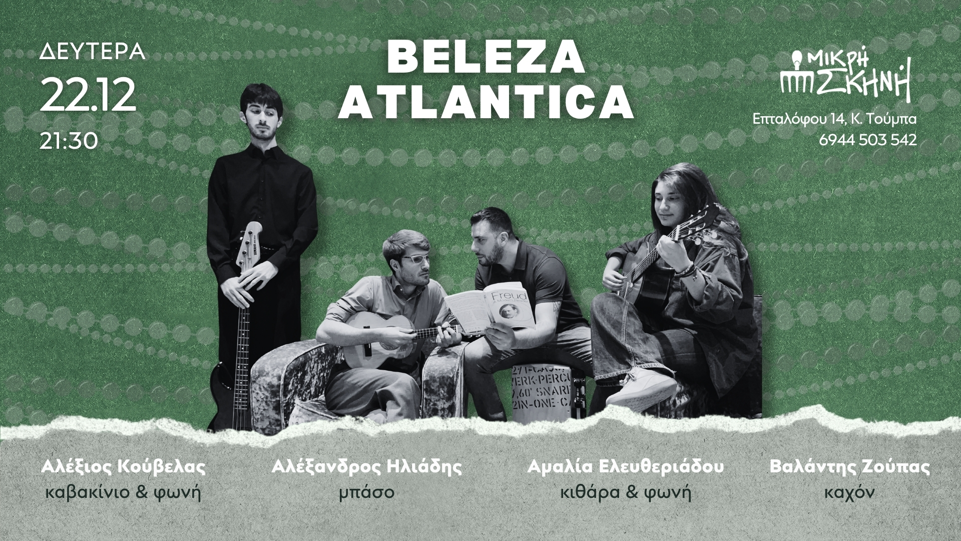 Η Beleza Atlantica είναι ένα τετραμελές σχήμα του οποίου το ρεπερτόριο πηγάζει από περιοχές που αγκαλιάζει ο Ατλαντικός ωκεανός: Βραζιλιάνικη σάμπα, Αργεντίνικο τάνγκο, μόρνα από το Πράσινο Ακρωτήρι, καθώς και πολλά πρωτότυπα κομμάτια του Αλέξη Κούβελα σε ελληνικό στίχο.