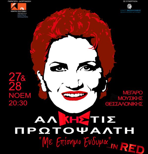 Το Κέντρο Πολιτισμού Περιφέρειας Κεντρικής Μακεδονίας παρουσιάζει τη σπουδαία ερμηνεύτρια Άλκηστις Πρωτοψάλτη, στις 27 & 28 Νοεμβρίου, στο Μέγαρο Μουσικής Θεσσαλονίκης, με τη συνοδεία της Συμφωνικής Ορχήστρας Δήμου Θεσσαλονίκης, σε μια διπλή, μουσική γιορτή In Red.